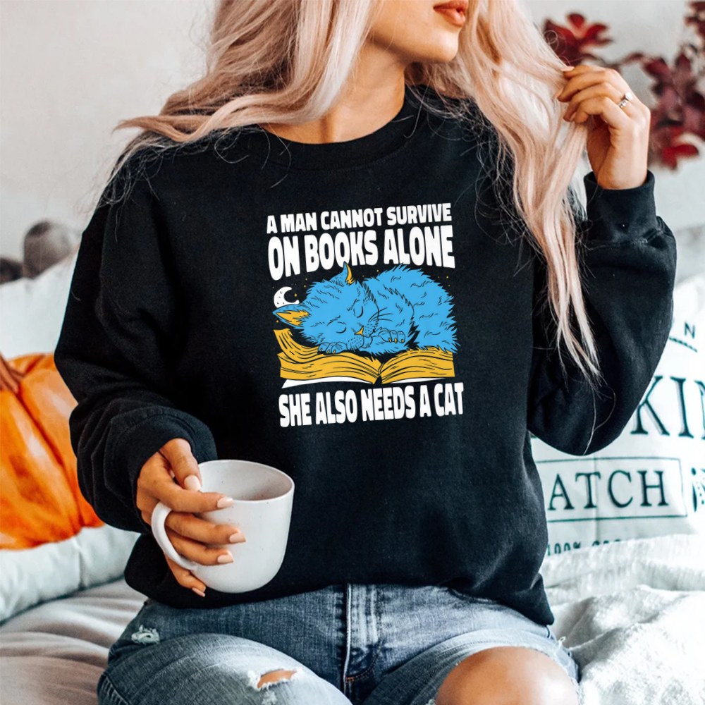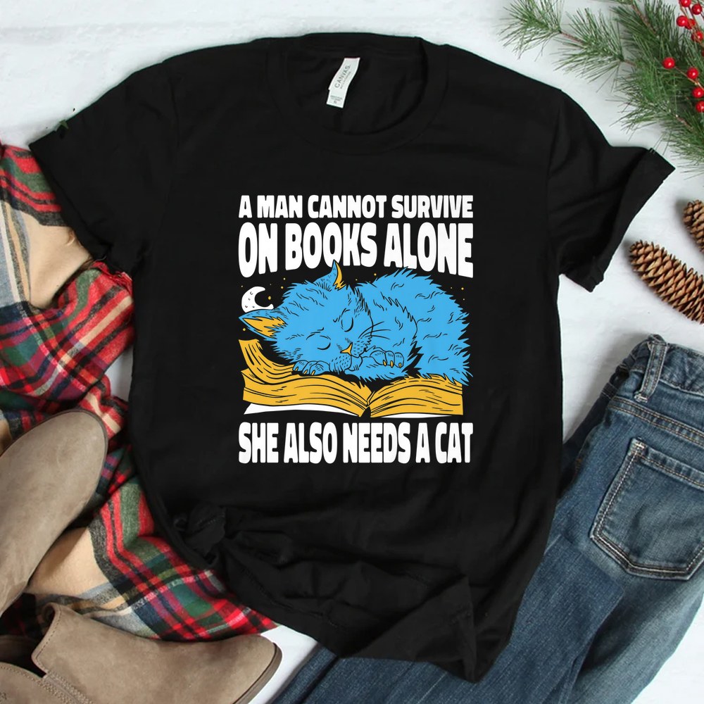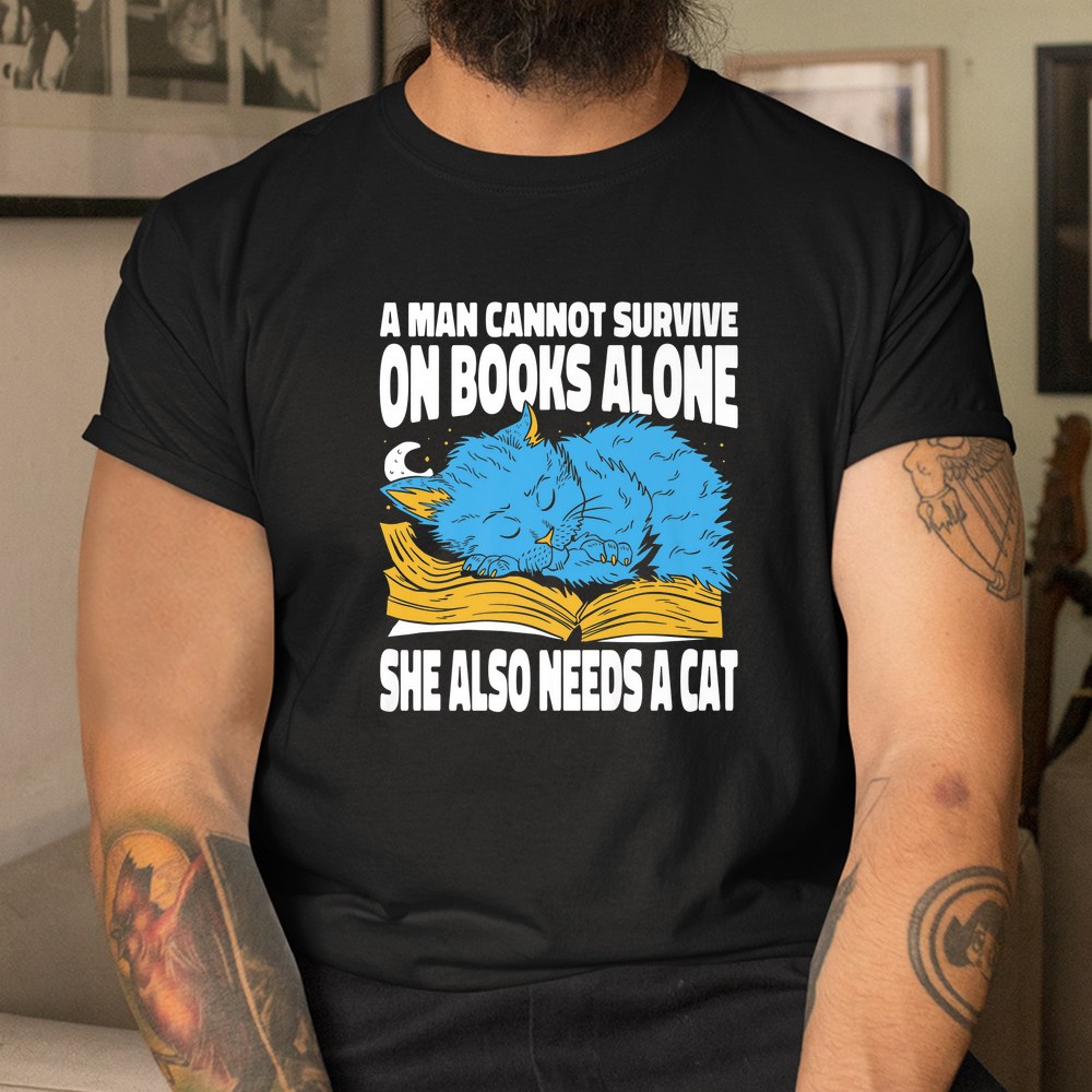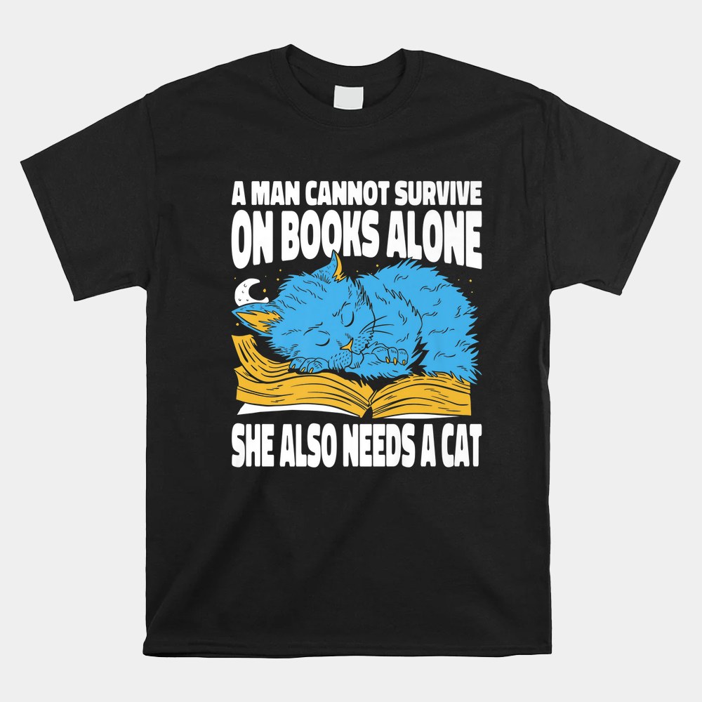 A Man Cannot Survive On Books Alone She Also Needs A Cat Shirt