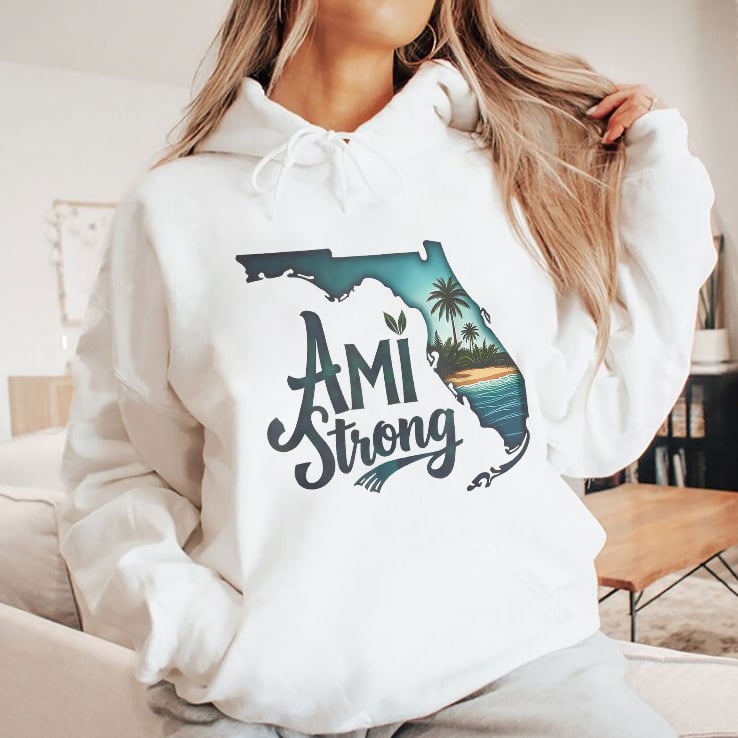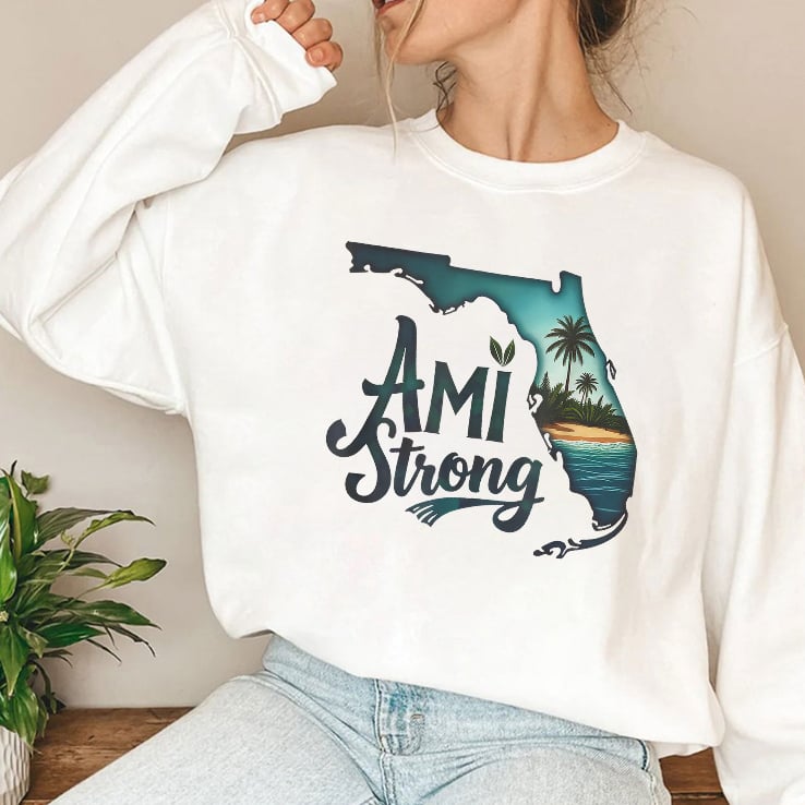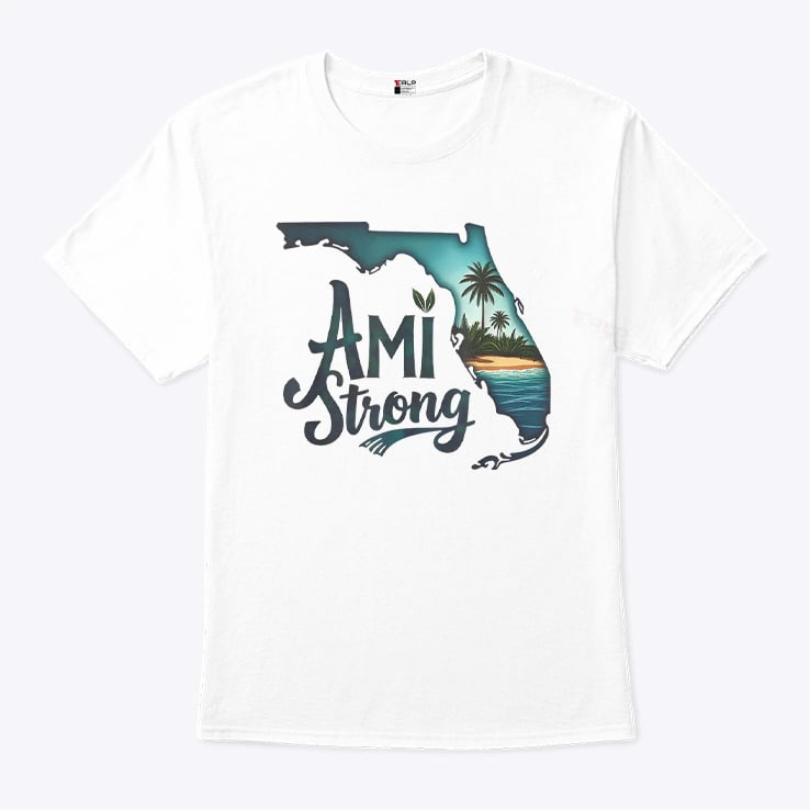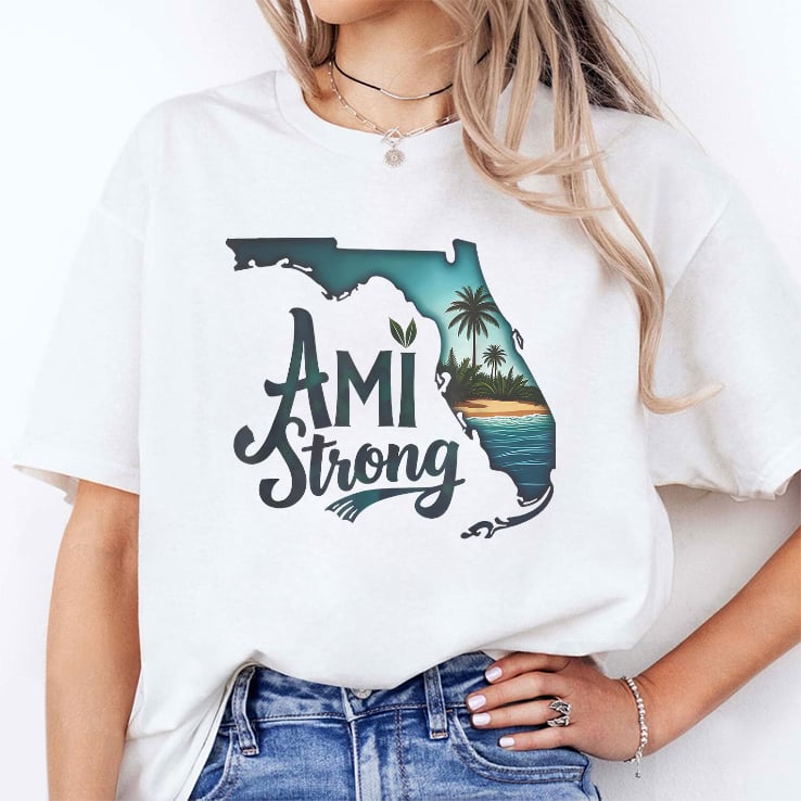 The shirt features the Florida map and the words “Ami Strong“, which refers to a message of resilience and solidarity with Anna Maria Island (AMI), a barrier island located off the west coast of Florida.