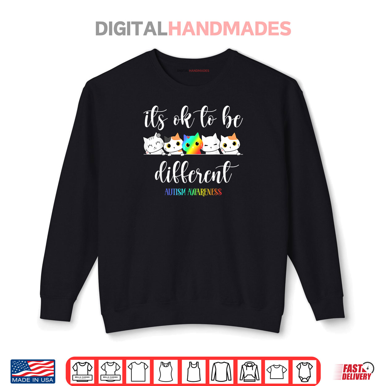autism awareness cat different, funny ok to be graphic tee, spring quirky apparel, funny cat humor shirt, bold different design, playful casual spring fashion, lighthearted autism tee, springtime quirky style, humorous cat shirt, cute awareness apparel