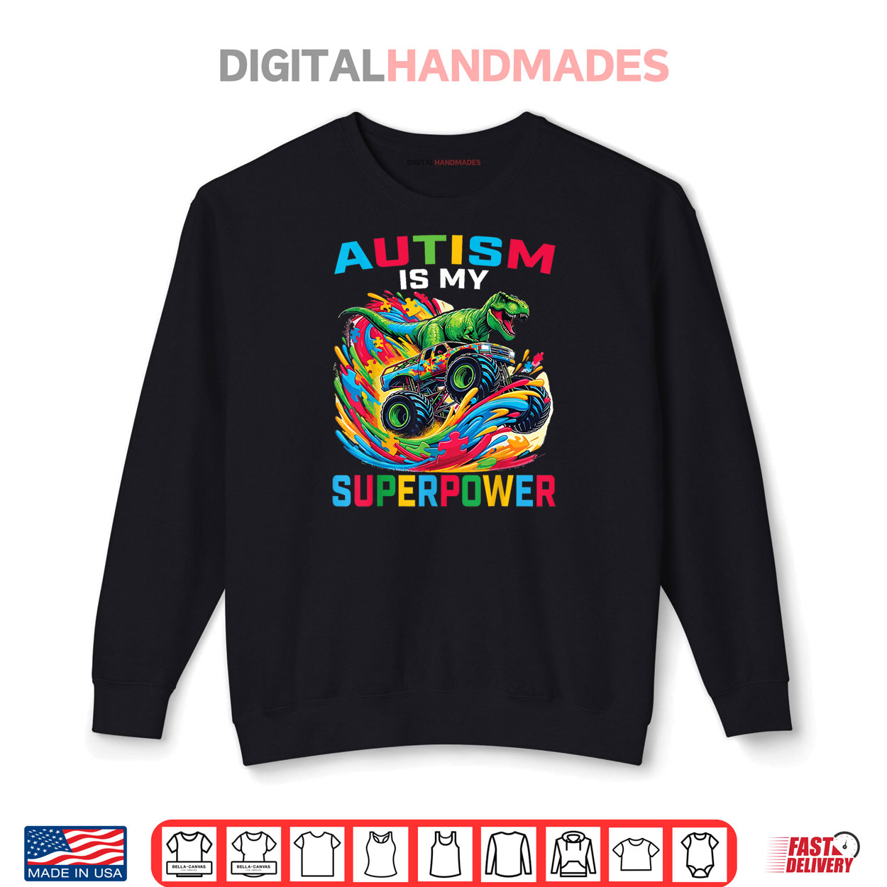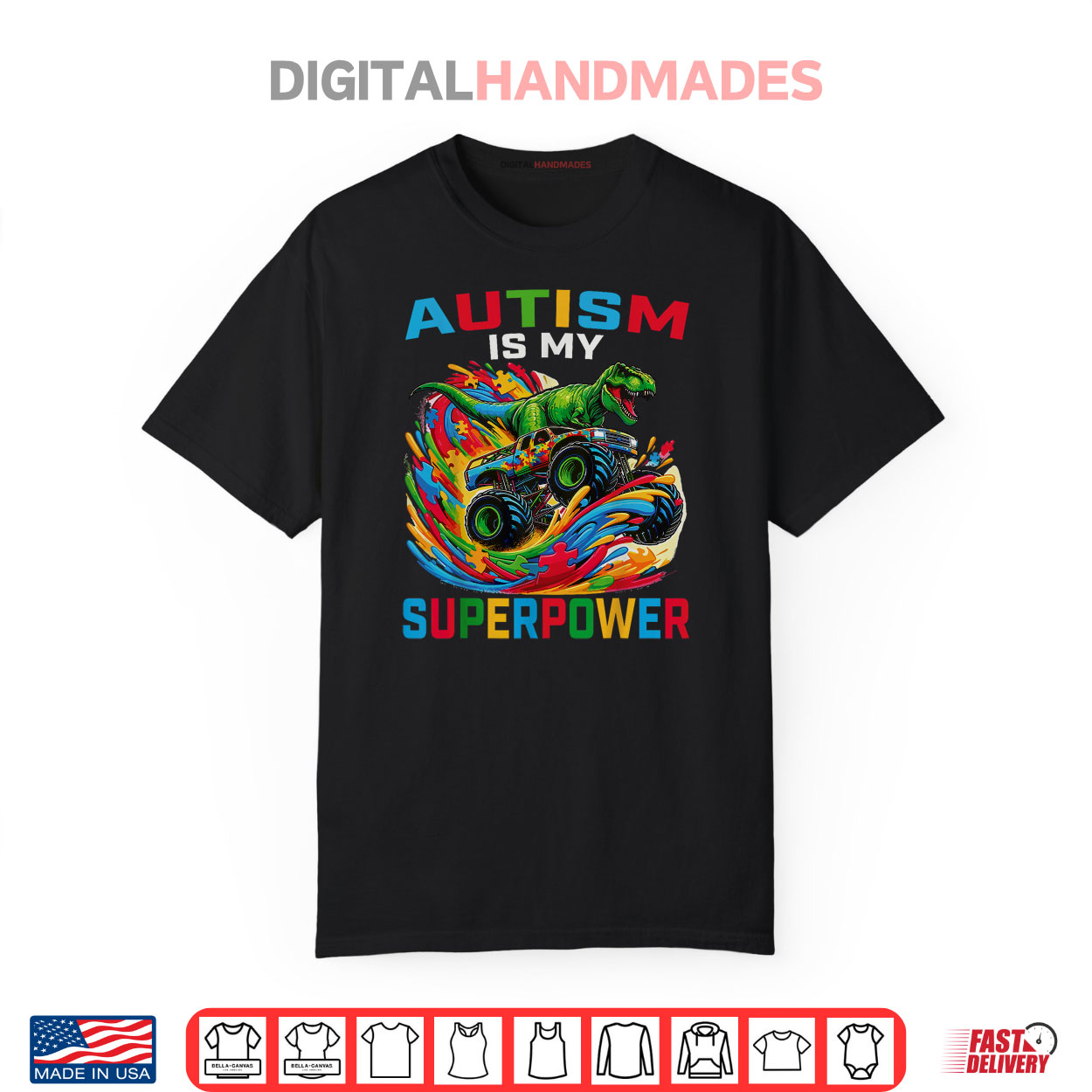 autism superpower dino trex, monster truck kids graphic tee, spring quirky apparel, funny superpower humor shirt, bold dino design, playful casual spring fashion, lighthearted autism tee, springtime boys style, humorous truck shirt, cute kids apparel