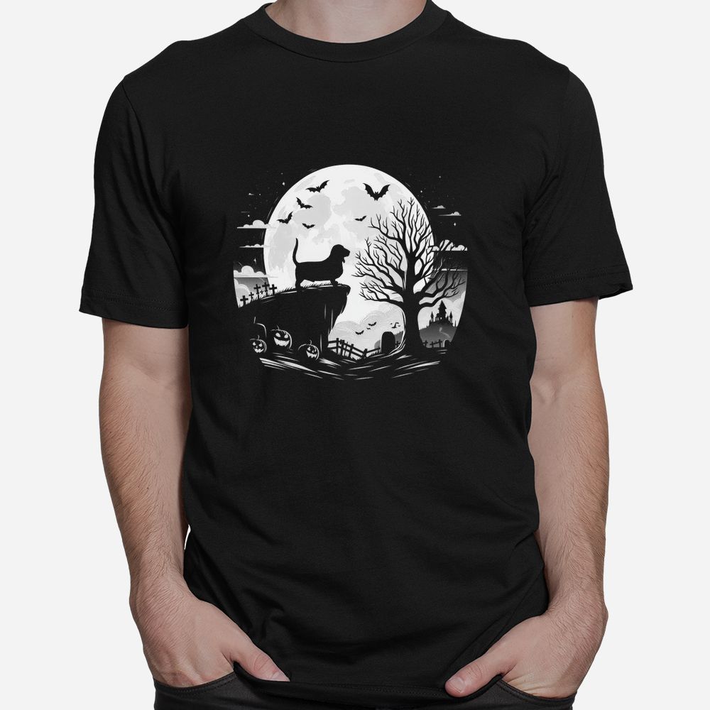 Basset Hound Dog And Moon Howl In Forest Dog Halloween Shirt, hoodie, sweatshirt, long sleeve and ladies T-shirt