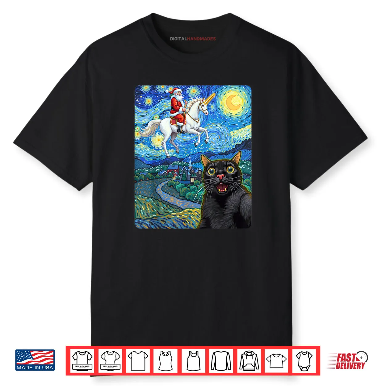 Black Cat Selfie with Santa Unicorn Starry Night Oil Paint Shirt