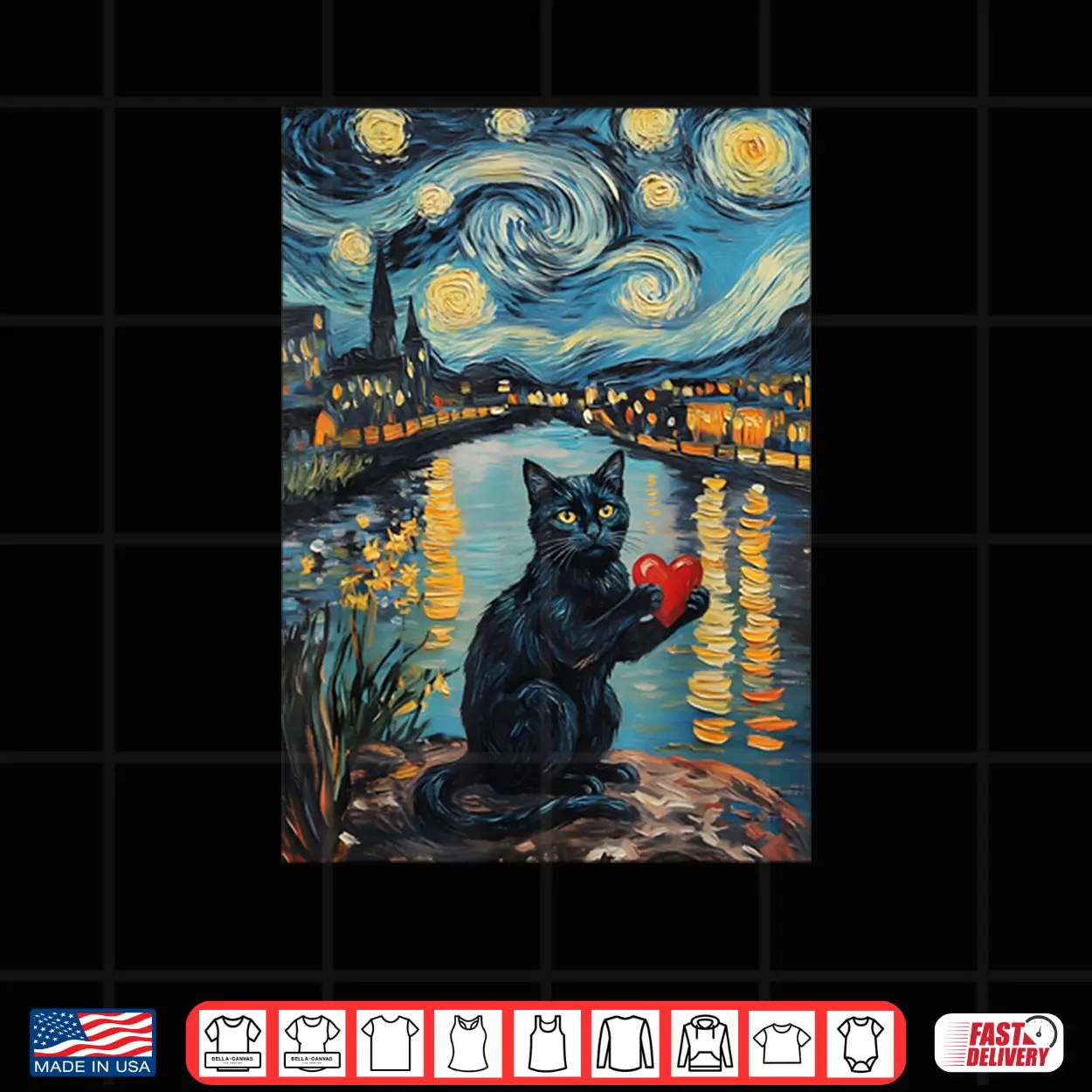 Black Cat Starry Night, Van Gogh, Valentine’s Day, cat lover, fine art parody, aesthetic, feline, romantic art, starry night, shirt