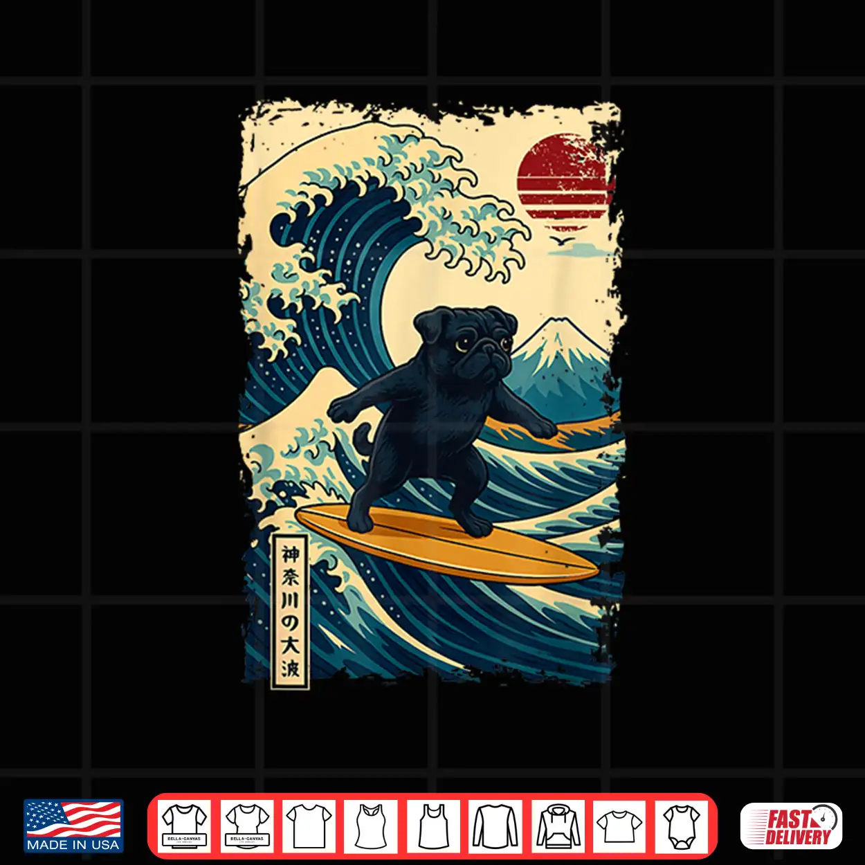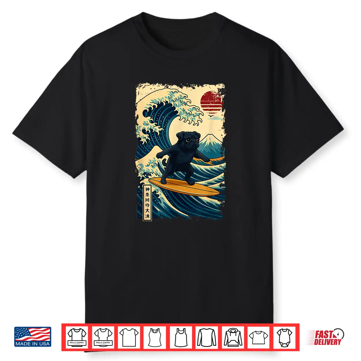 Black Pug Japanese Kanagawa Wave Surfing Japan Mom Dad Kids Shirt