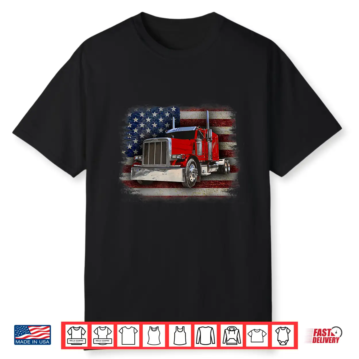 Black-T-Shirt-American Flag And Big Rig Trucker Shirt