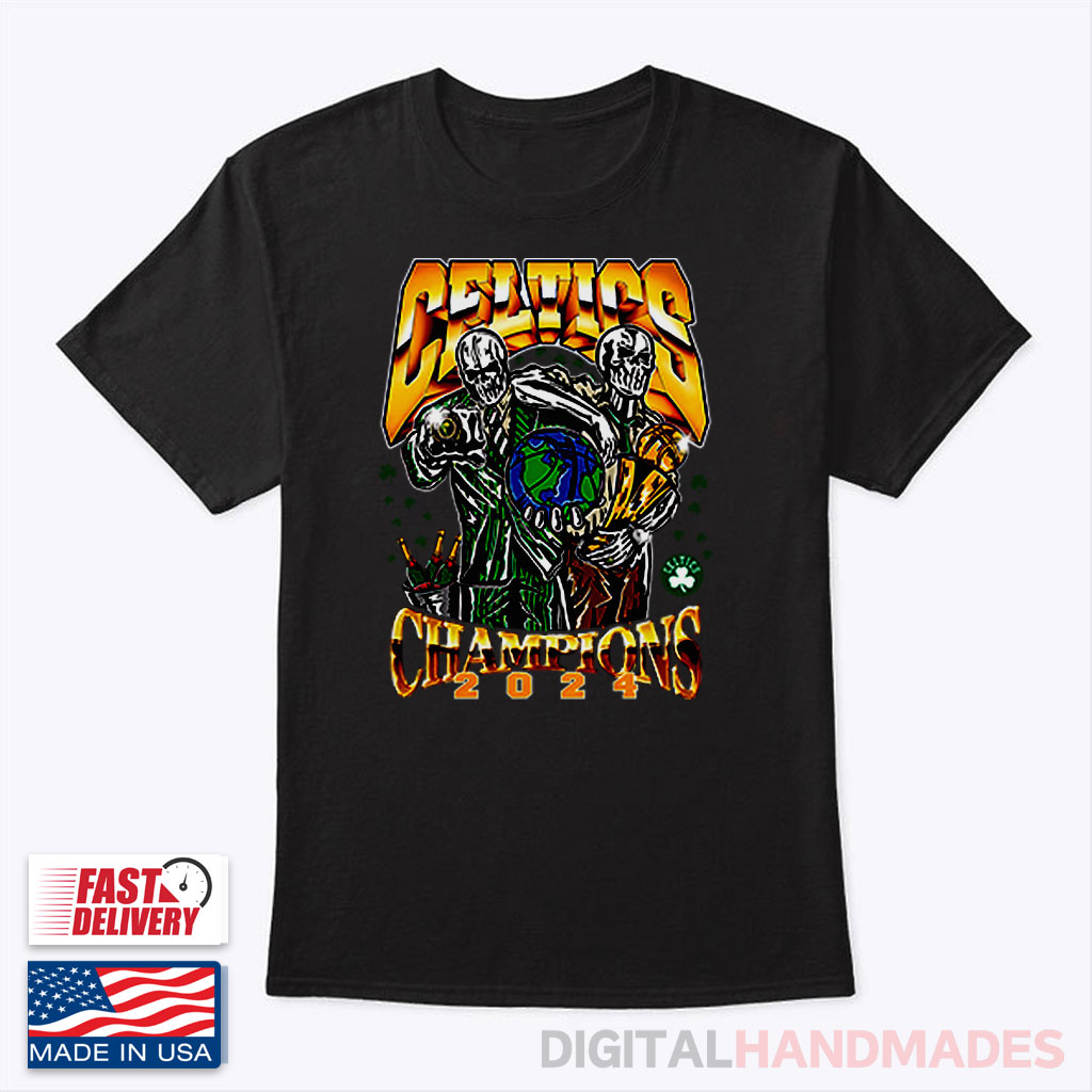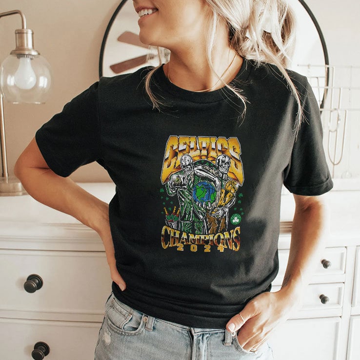 The shirt with the unique design and the words “Celtics Champions 2024” represents the passion and unity among fans celebrating the Boston Celtics team’s success.