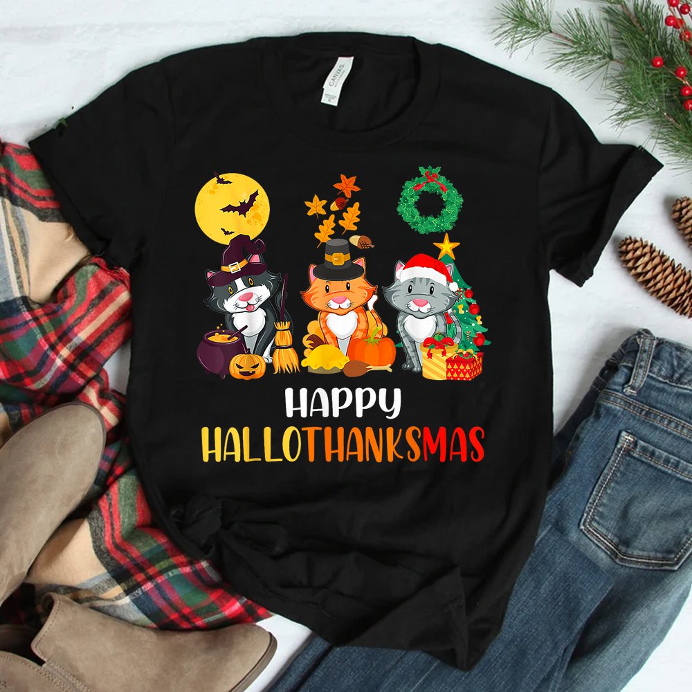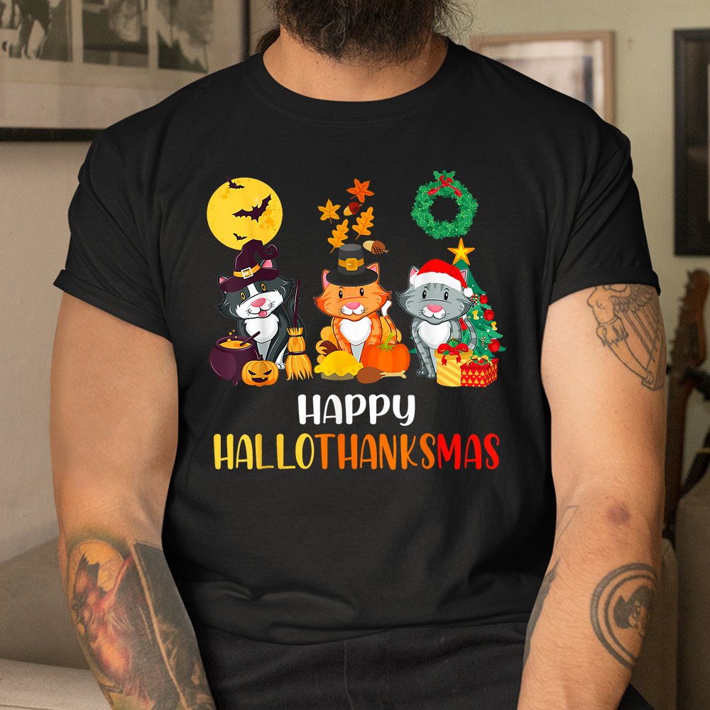 Cat Halloween Christmas Happy Hallothanksmas Thanksgiving Shirt