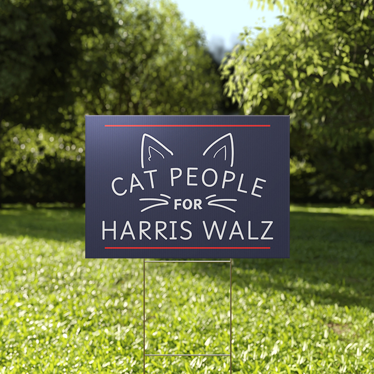 The yard sign with the slogan “Cat People For Harris Walz 2024” reflects support for Kamala Harris and Tim Walz in the 2024 presidential election, specifically targeting individuals who identify as “cat people”.