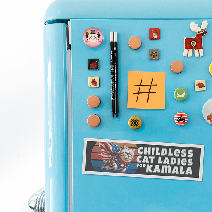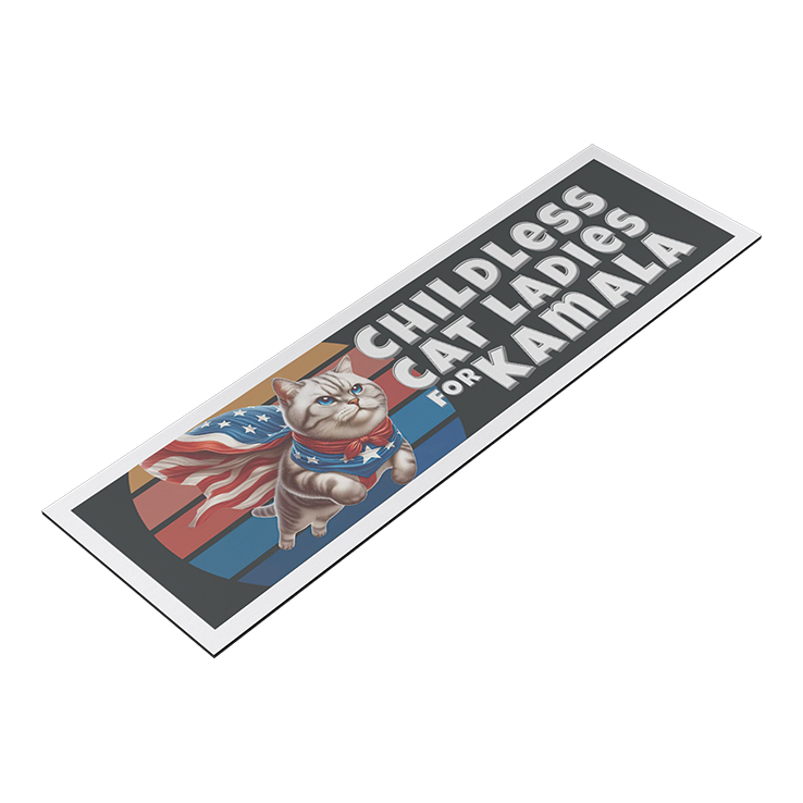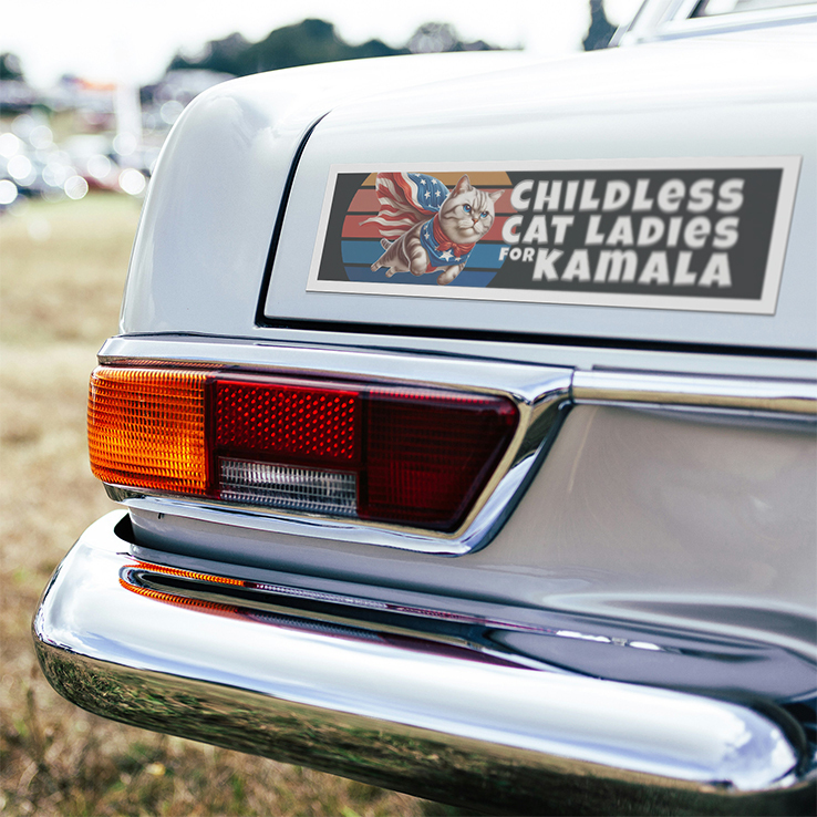 The Car Magnet slogan is a reclaiming and proud declaration of support for Kamala Harris from women who identify with or support the “childless cat lady” stereotype. It turns the insult into a badge of solidarity and empowerment.