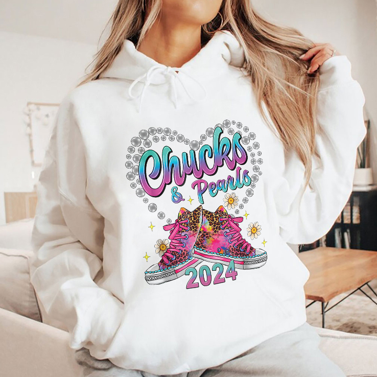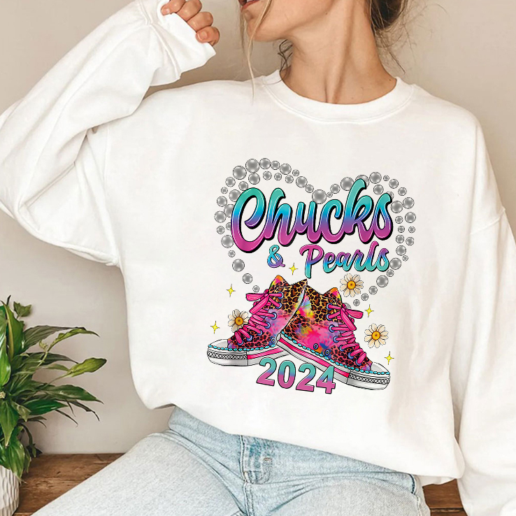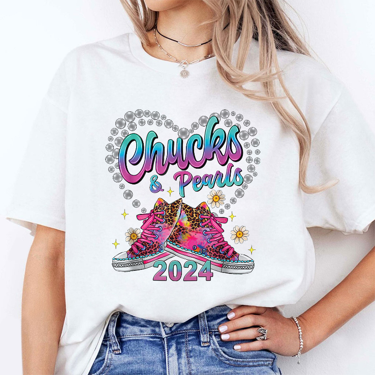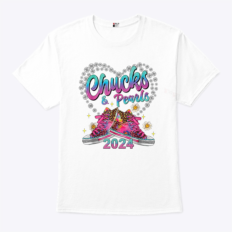 The shirt mentions Vice President Kamala Harris‘ fashion choices, often seen wearing Chuck Taylor sneakers and pearls. This combination symbolizes her casual and approachable style (Chucks) alongside elegance and sophistication (Pearls).