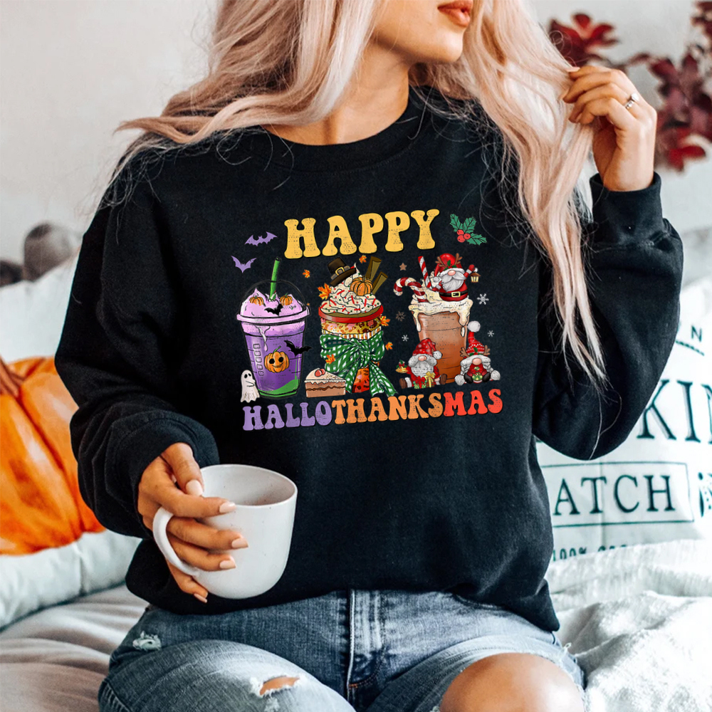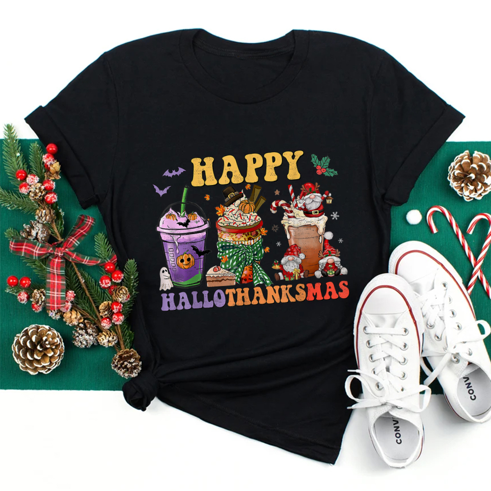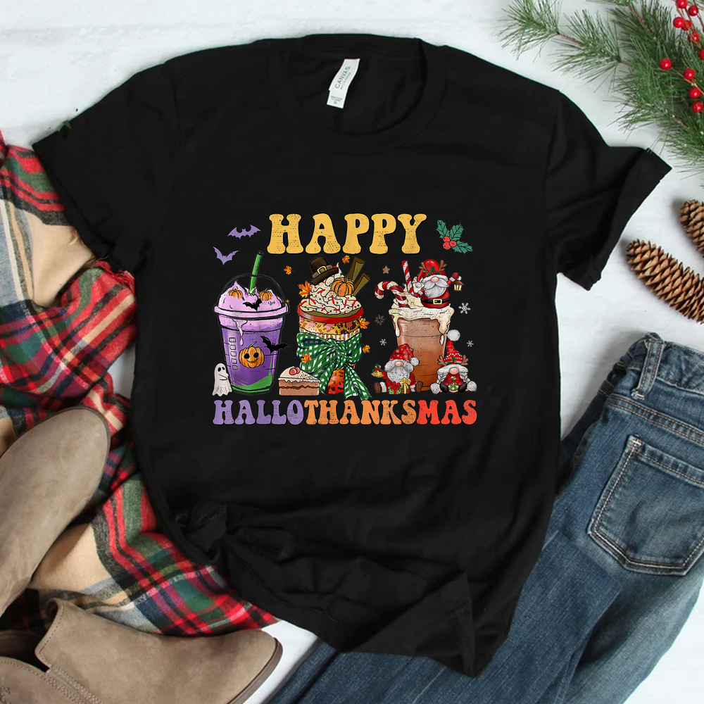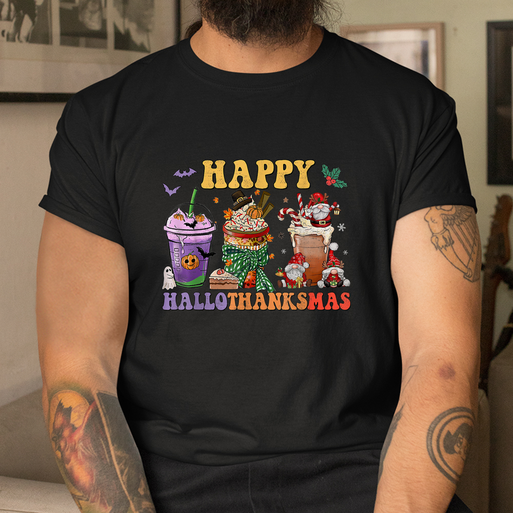 Coffee Halloween Thanksgiving Christmas Happy Hallothanksmas Shirt, hoodie, sweatshirt, long sleeve and ladies T-shirt