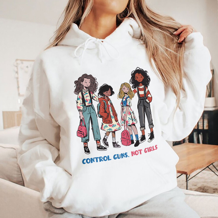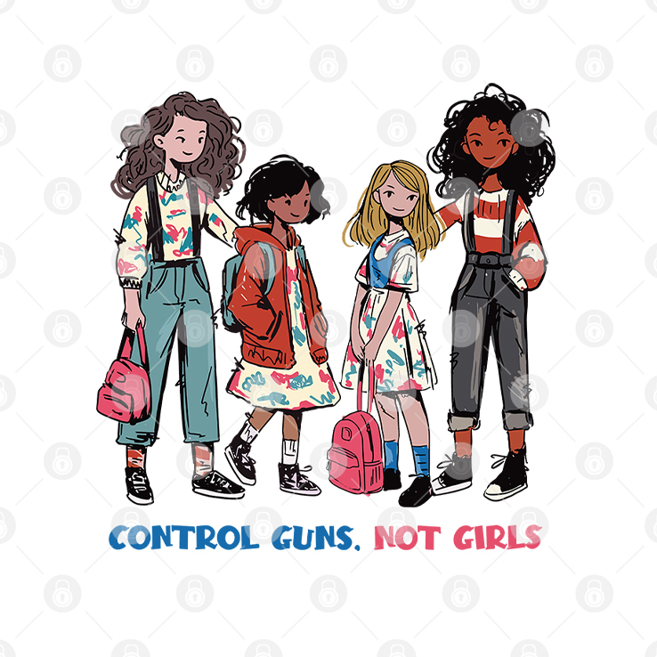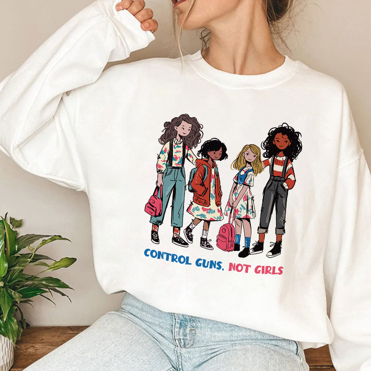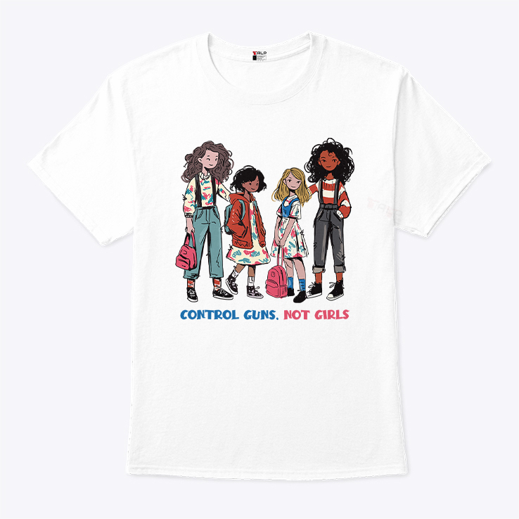 The t-shirt features the image of four girls and the phrase “Control Guns Not Girls”. It advocates for stricter gun control laws rather than restrictions on women’s rights or freedoms.