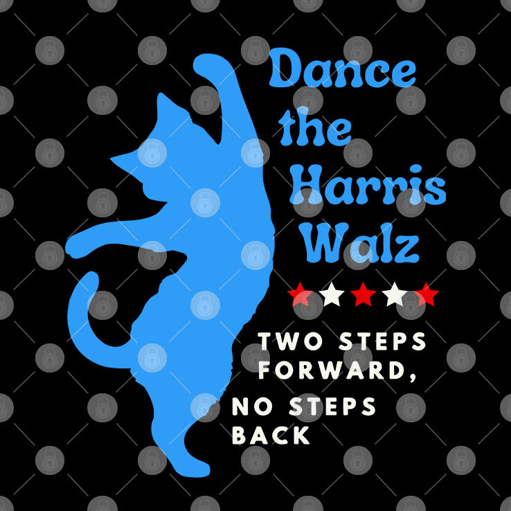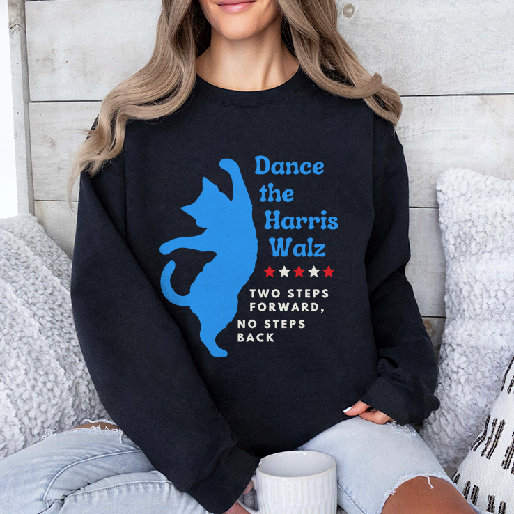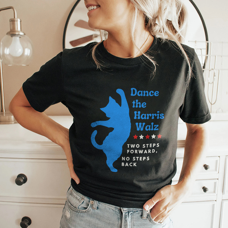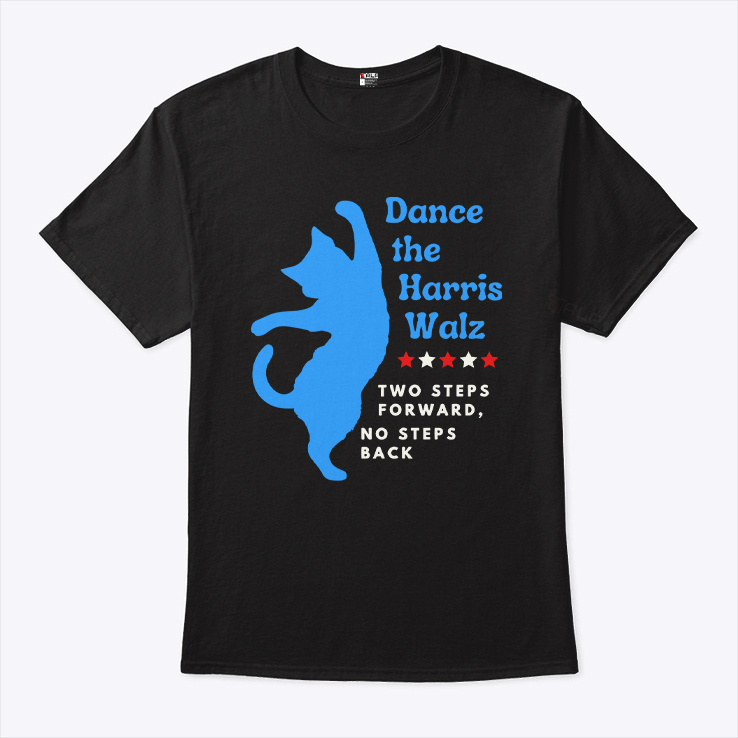 The shirt features an image of a cat and the phrase “Dance The Harris Walz. Two Steps Forward, No Steps Back“.