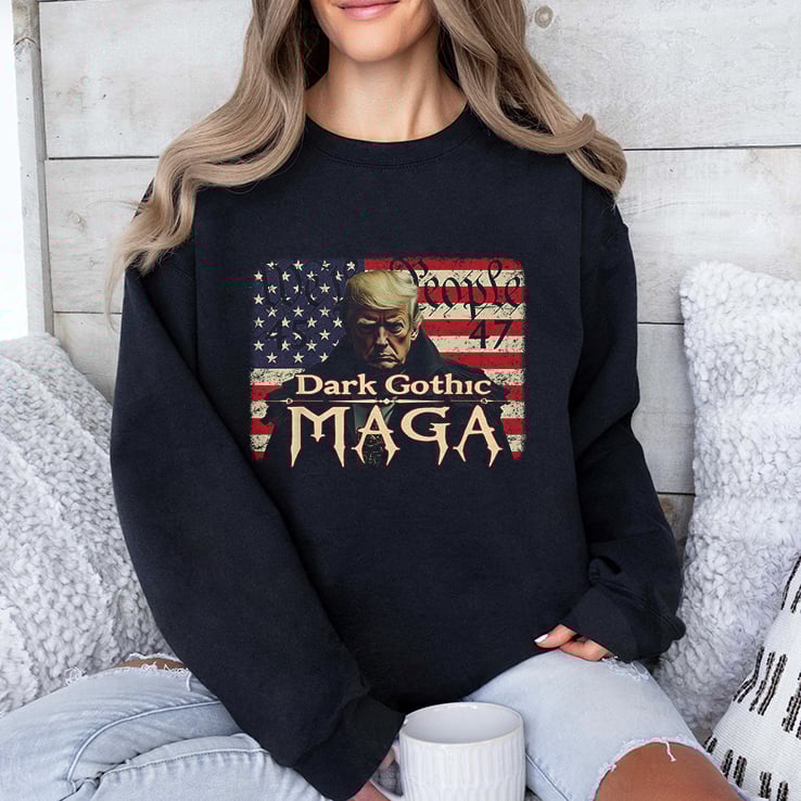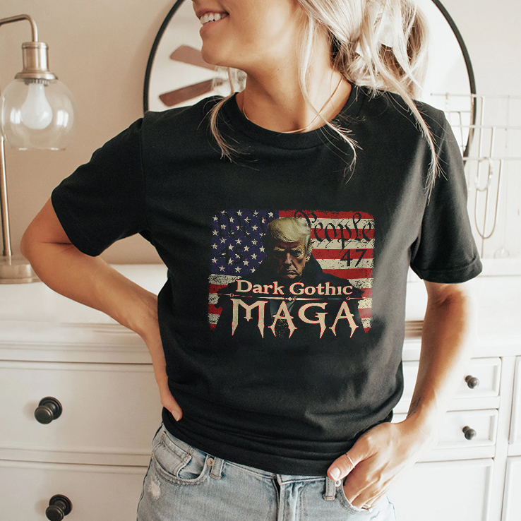 The shirt features an image of Donald Trump and the phrase “Dark Gothic MAGA Trump We People 45 47″, which refers to a blend of political and cultural themes. “Dark MAGA” is a recent concept that often reflects a more intense, combative stance within Trump-supportive circles, embracing a darker, stylized version of patriotism and loyalty to Trump’s political vision.