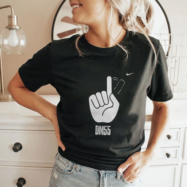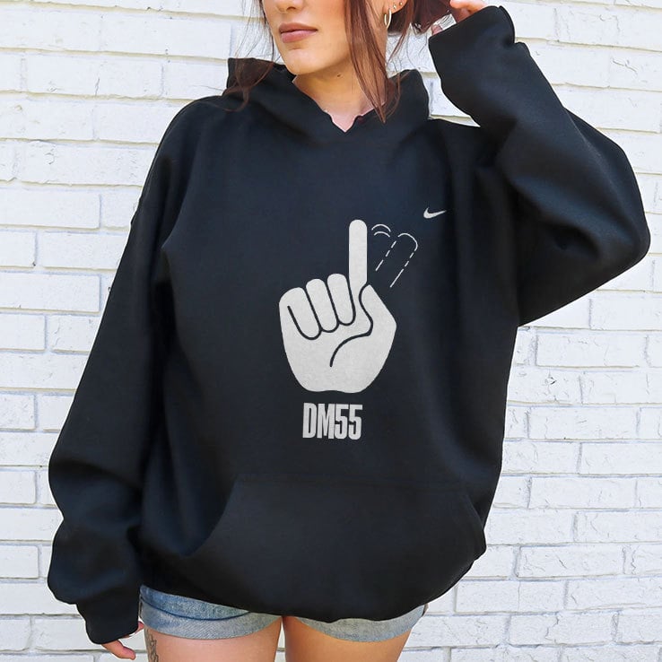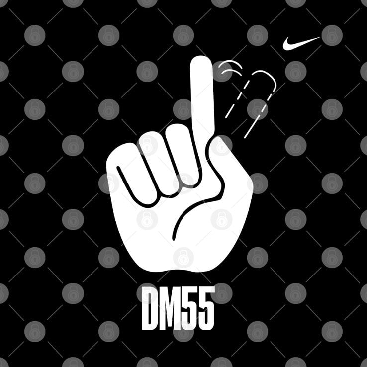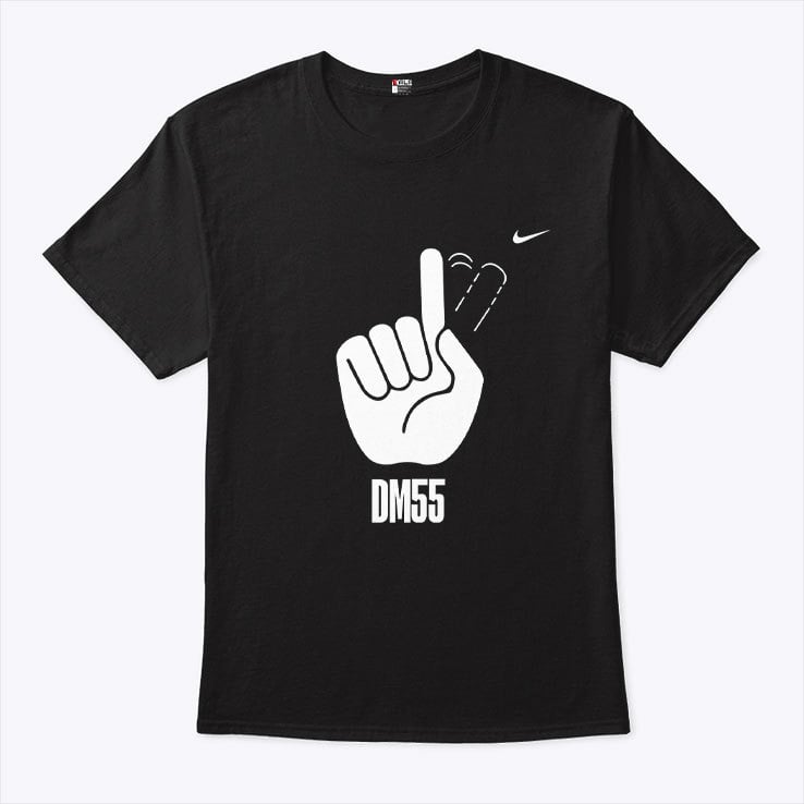 The “DM55” stands for Dikembe Mutombo’s initials (DM) and the number 55, which was his jersey number throughout his NBA career. Mutombo was famous for his shot-blocking ability, often using his hand to reject opponents’ shots, which made this symbolic gesture popular.