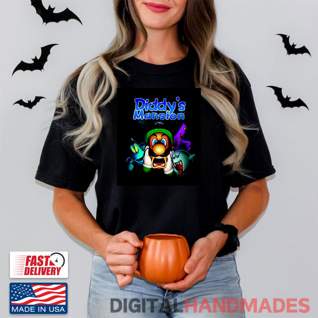 Diddy’s Mansion Luigi Super Mario T Shirt is a humorous mashup of Luigi’s Mansion, a popular Nintendo game, and Diddy Kong, a character from the Donkey Kong series.