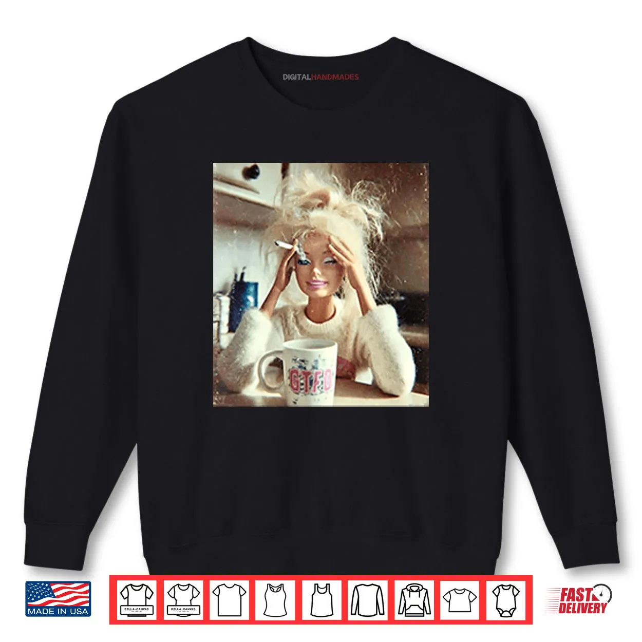 distressed doll face, meme shirt, aesthetic, internet culture, ironic, edgy, viral, niche, doll art, shirt
