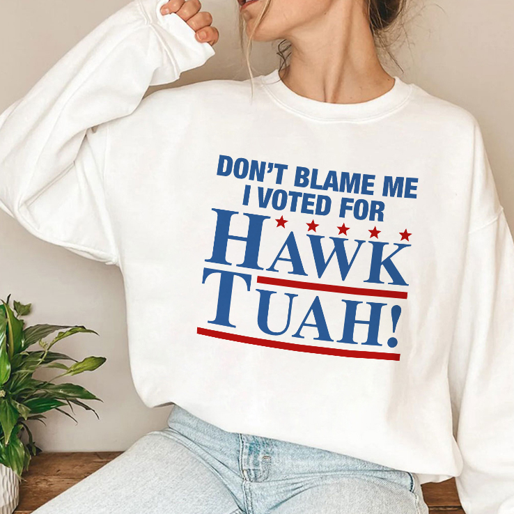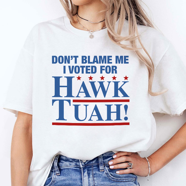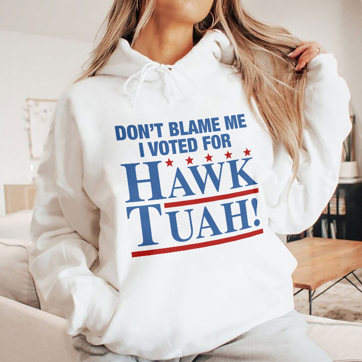 Don’t Blame Me I Voted For Hawk Tuah is a joke that highlights the widespread recognition of the viral “Hawk Tuah” moment. The phrase “Hawk Tuah” has since been embraced in meme culture, symbolizing a humorous gesture of excitement.