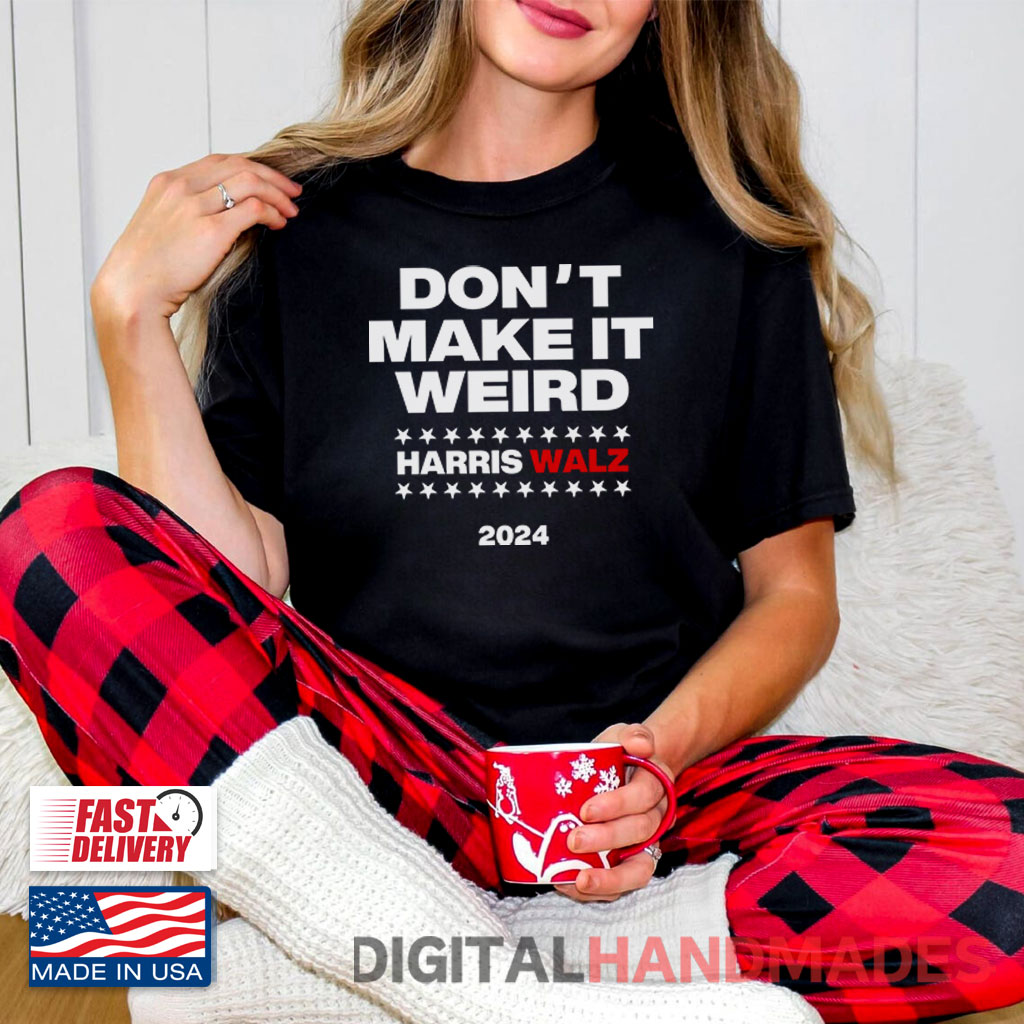 The t-shirt features the phrase “Don’t Make It Weird Harris Walz 2024”. It plays on a popular cultural context where “weird” often implies social awkwardness or discomfort.