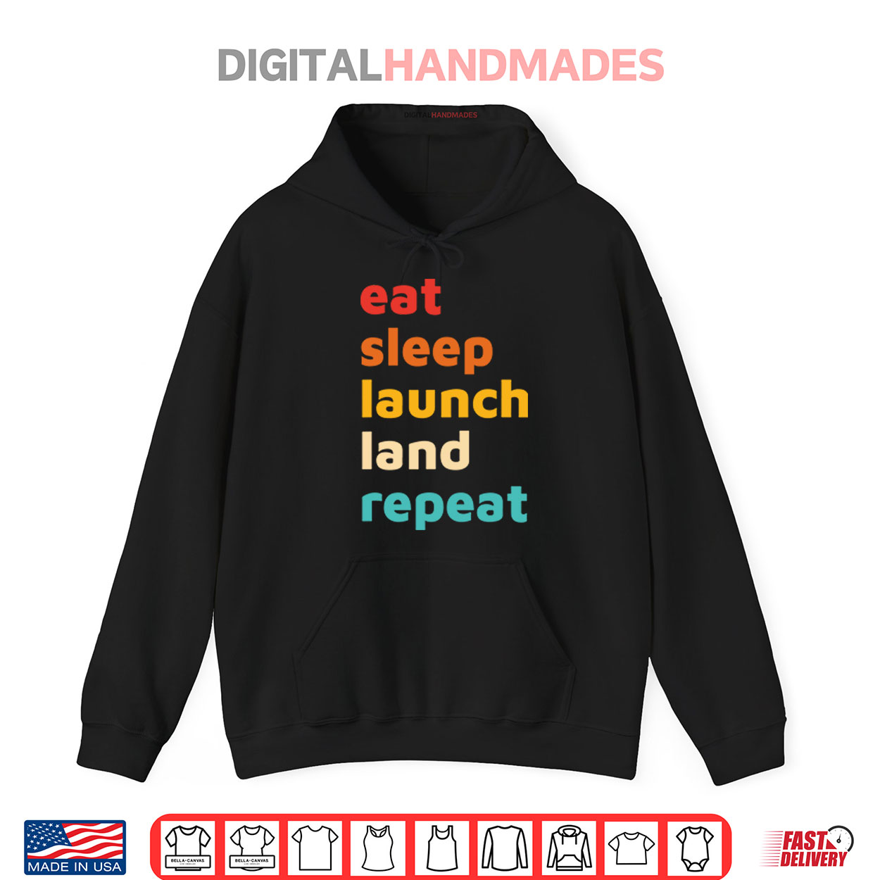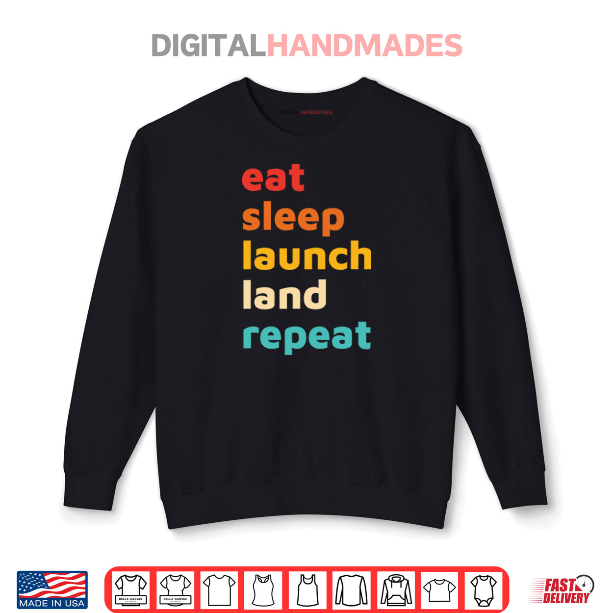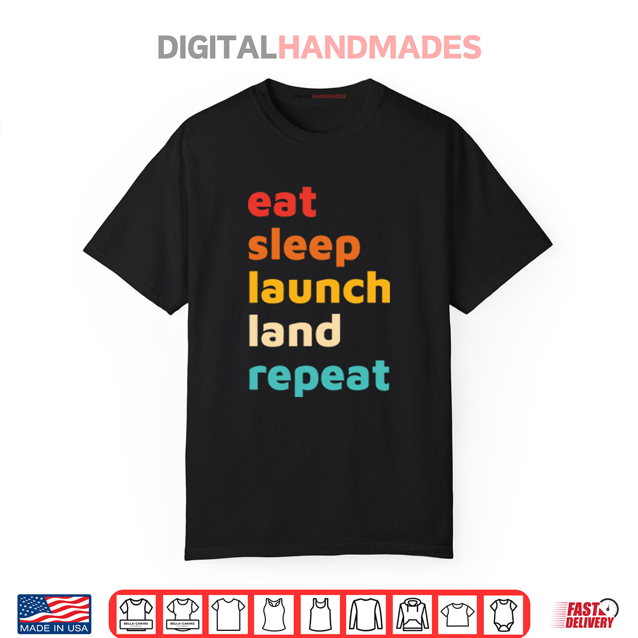 eat sleep launch land repeat, space mission enthusiast shirt, humorous aerospace apparel, spring space lover fashion, bold mission graphic tee, casual space-inspired wear, playful repeat cycle design, springtime aerospace humor, funny space fan shirt, lighthearted mission tee