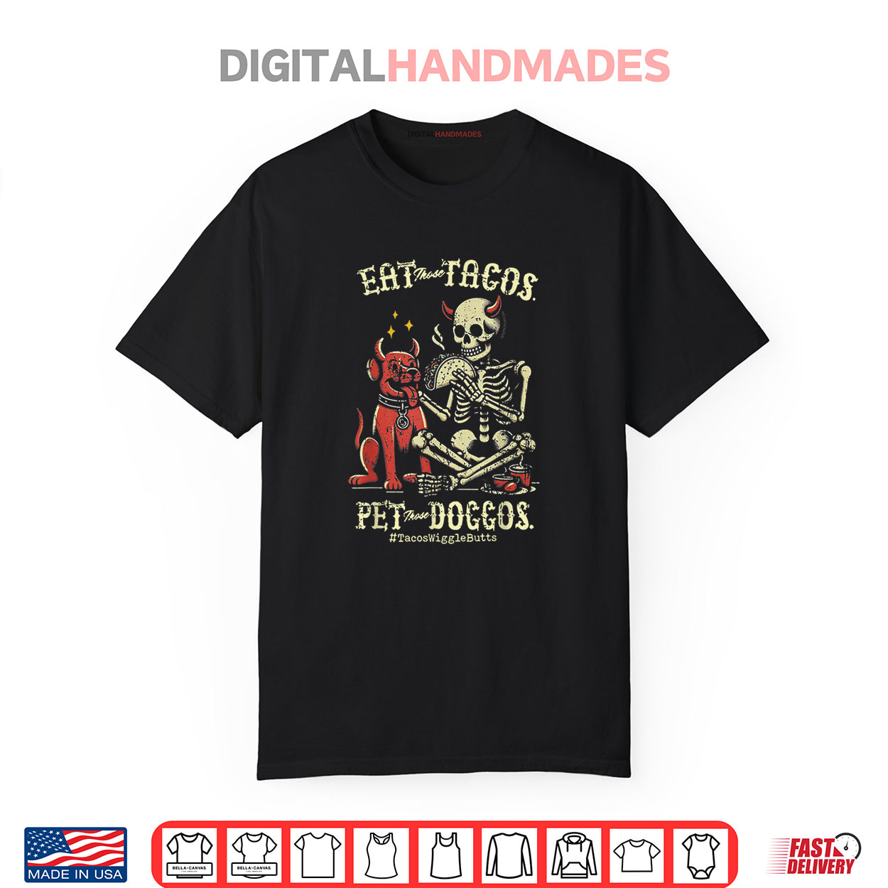 eat tacos pet doggos humor, funny food and pet graphic tee, spring casual playful apparel, humorous taco dog lover shirt, bold quirky design, lighthearted spring fashion, playful foodie casual tee, springtime dog lover style, cute tacos and dogs shirt, funny pet humor apparel