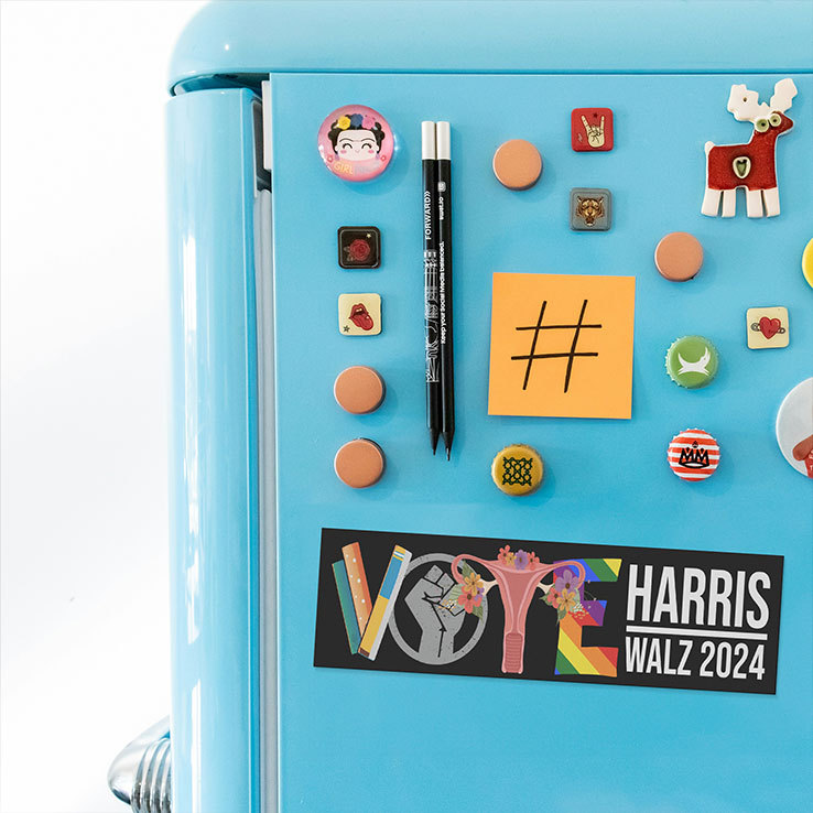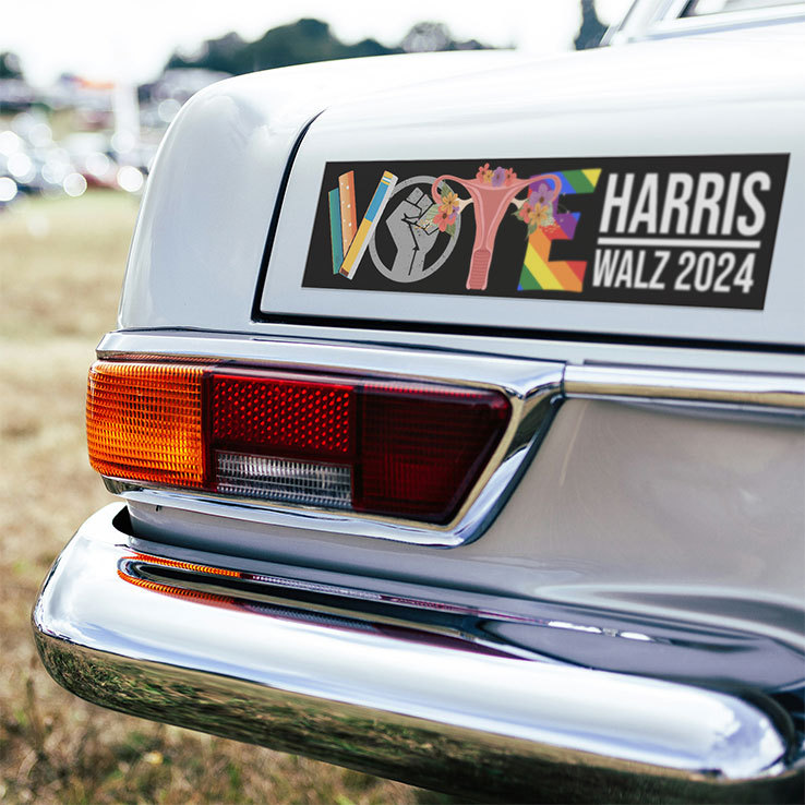 Overall, the car magnet combines advocacy for progressive causes with political support for Kamala Harris and Tim Walz.