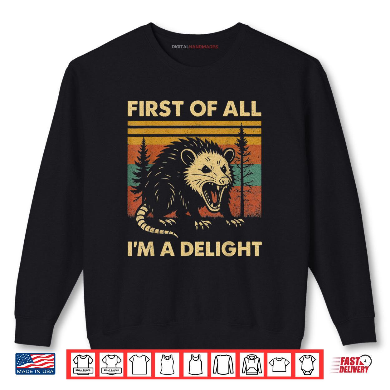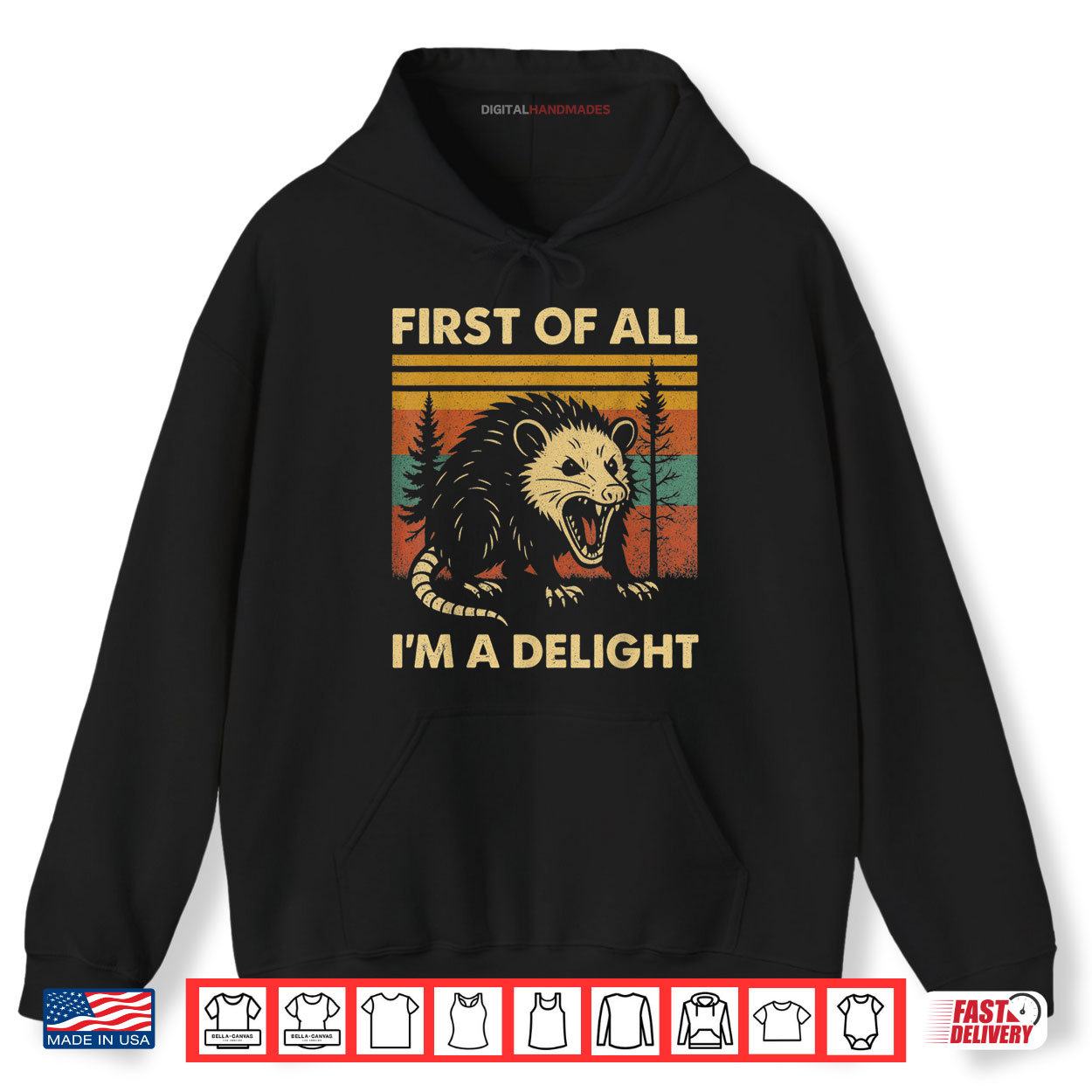 First Of All I’m A Delight Sarcastic Angry Opossum Shirt, I’m A Delight Shirt, Sarcastic Opossum Shirt, Angry Opossum Shirt, Funny Animal Shirt, Sarcastic Shirt, Humorous Shirt, Opossum Shirt, Witty Shirt, Gag Gift Shirt