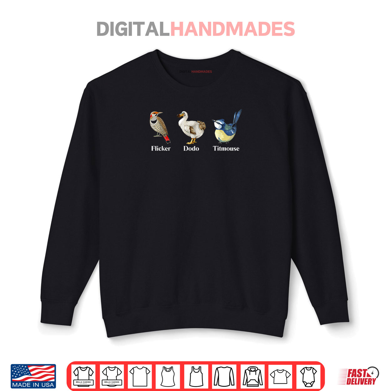 flicker dodo titmouse bird humor, clever birdwatcher graphic tee, spring quirky apparel, funny bird design shirt, bold playful design, lighthearted casual spring fashion, humorous bird tee, springtime nature style, funny birdwatcher shirt, cute spring humor wear