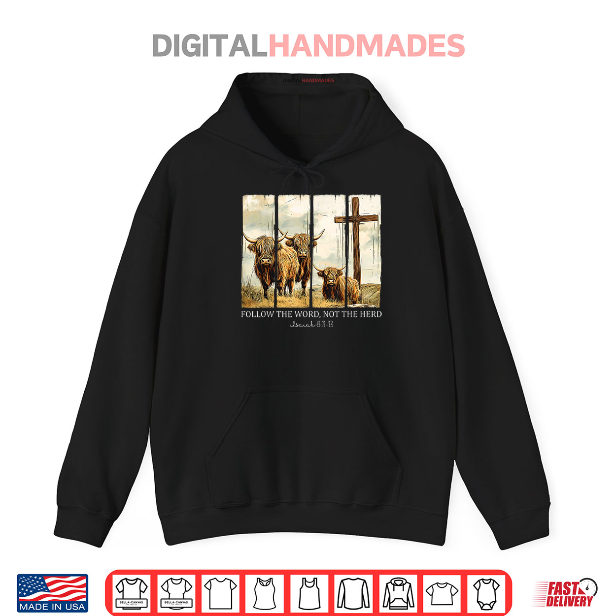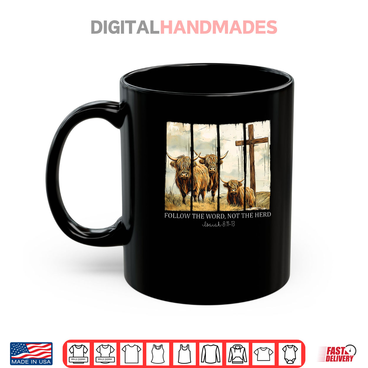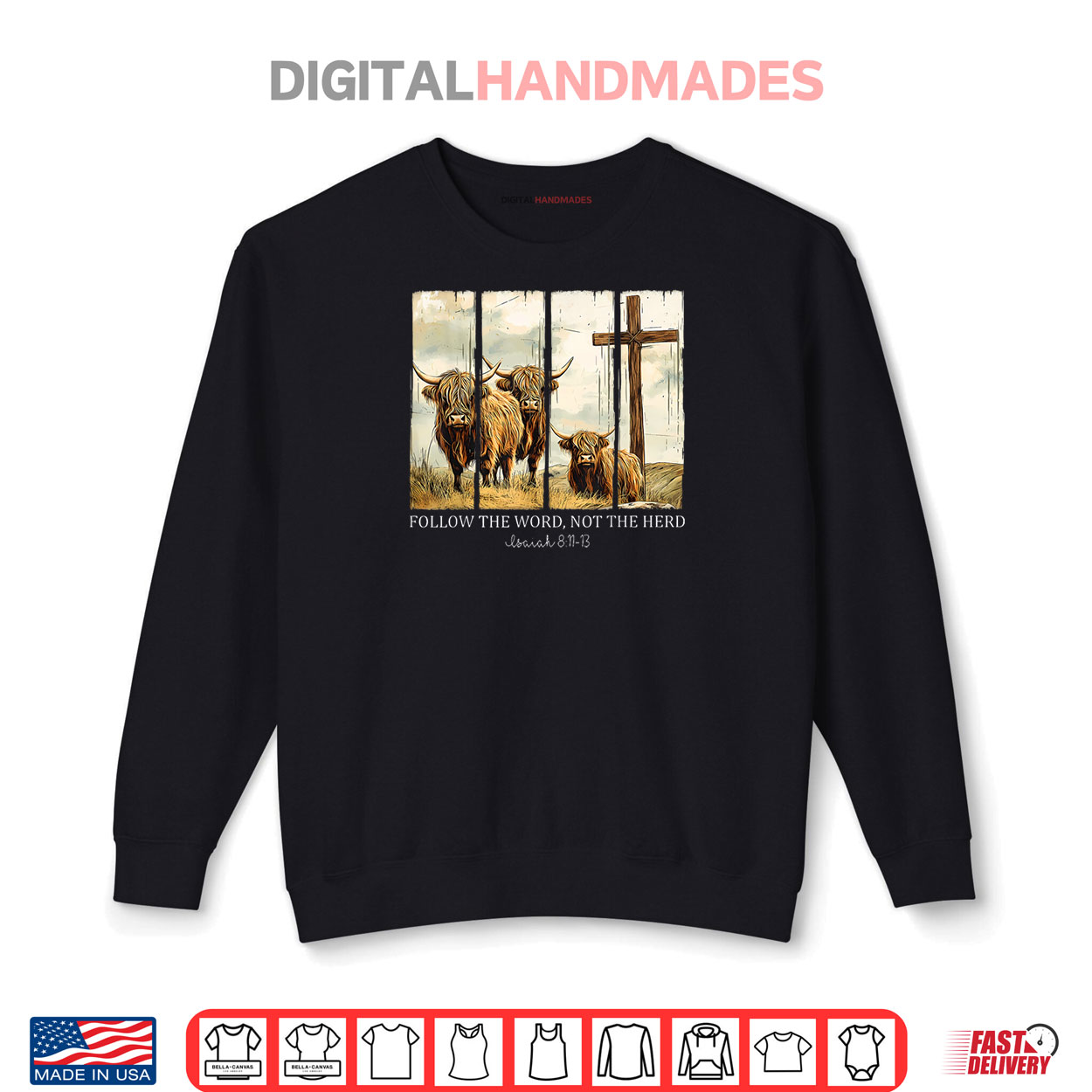 christian cow shirt, highland cow faith tee, follow the word shirt, not the herd christian shirt, western bible verse tee, spiritual cattle design, country faith apparel, rural christian message, inspirational cow shirt, jesus is the shepherd tee