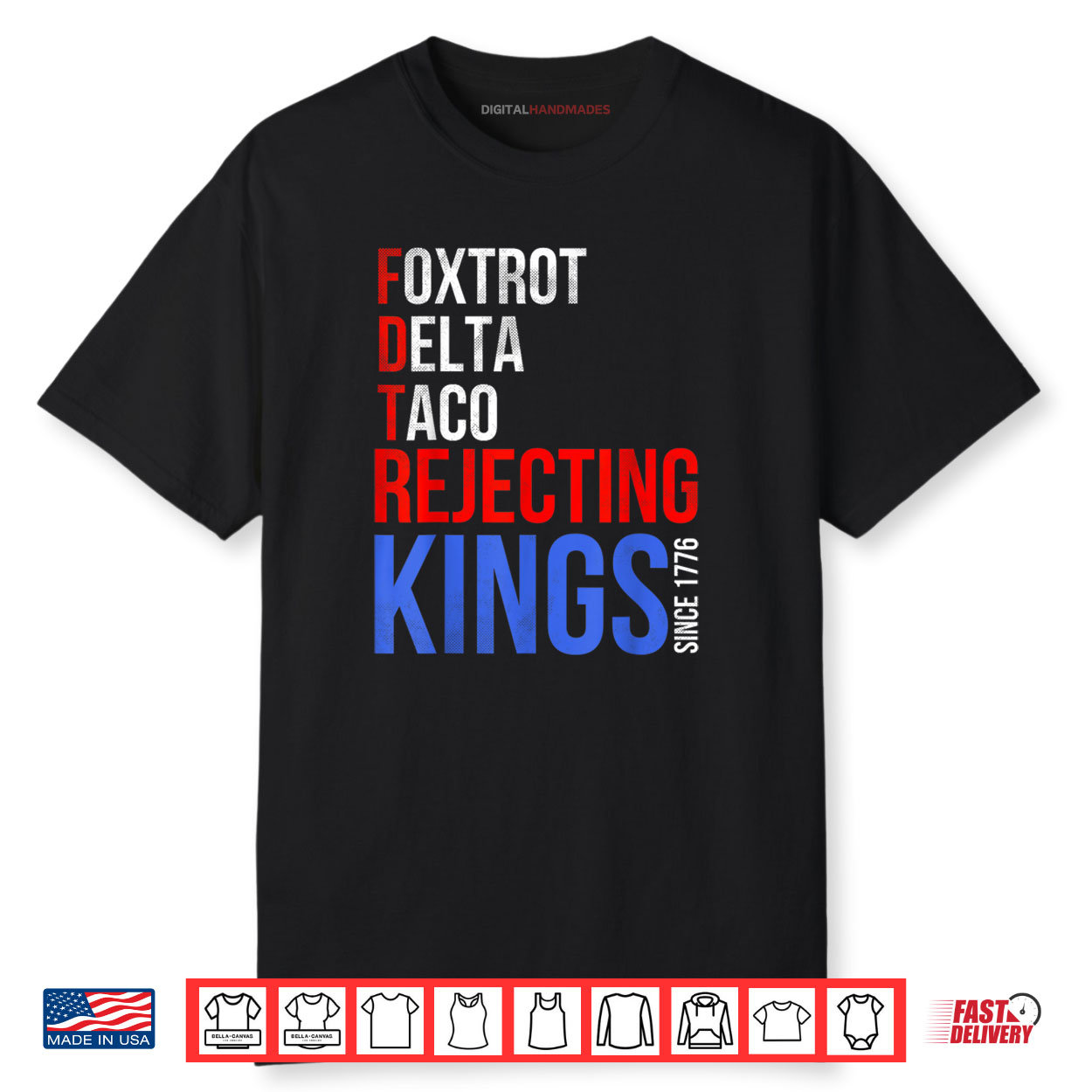 Foxtrot Delta Taco No King In America Since 1776 USA Flag Shirt, Foxtrot Delta Taco Funny Political Tee Shirt, No King In America USA Flag Gift Shirt, Anti Trump Acronym Humor Apparel Style Shirt, Phonetic Alphabet Slogan For Patriots Shirt, Military Code And Political Satire Fun Shirt, Never Trump Since 1776 Message Shirt, Funny And Sarcastic Protest Shirt, We The People Say No To Kings Shirt, Libertarian And Anti Authoritarian Shirt