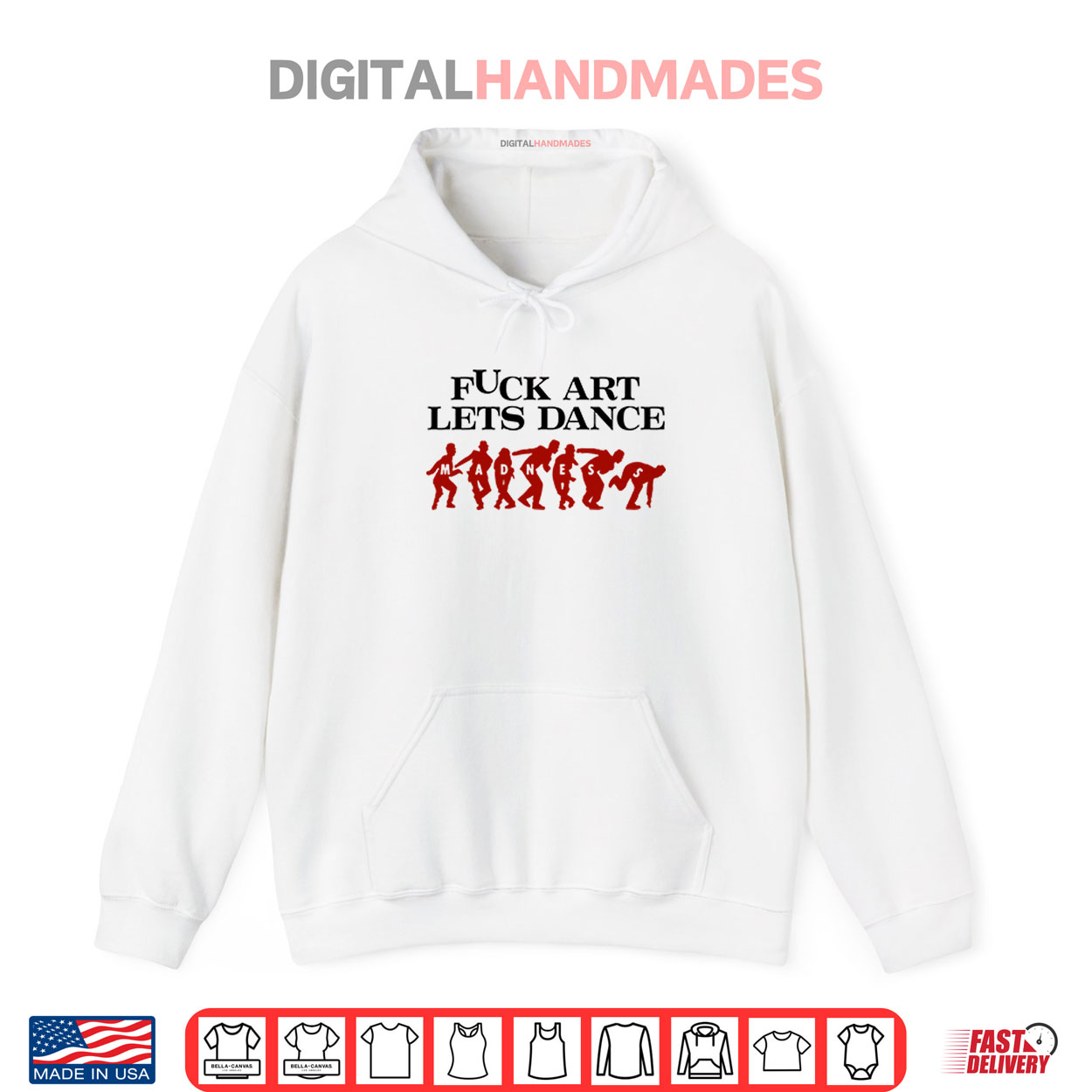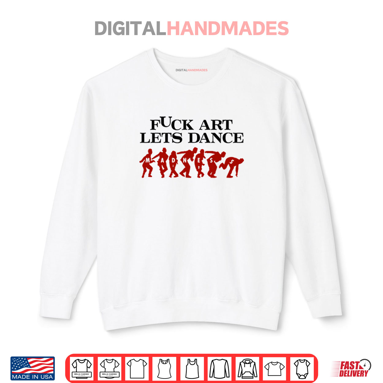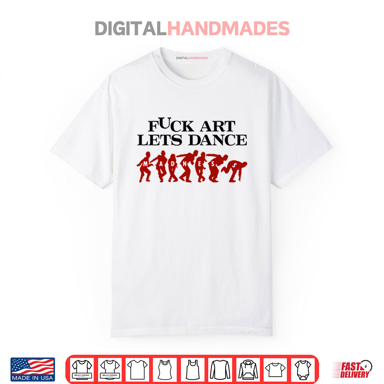 anti-art shirt, dance party tee, rave statement shirt, rebellious fashion, punk aesthetic tee, underground clubwear, bold slogan shirt, counterculture fashion, edgy nightlife shirt, expressive chaos tee