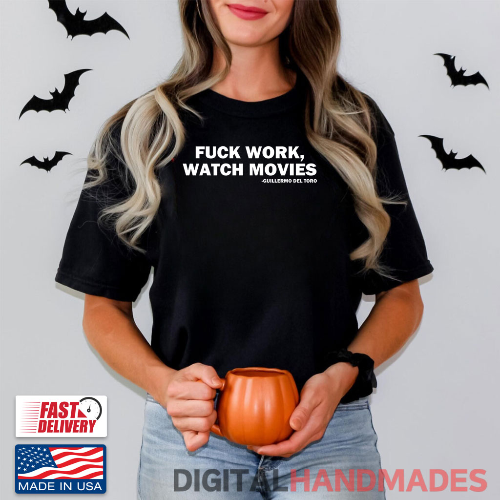 The shirt with the phrase “Fuck Work Watch Movies – Guillermo Del Toro” reflects the ethos of prioritizing film watching over work, a sentiment that resonates deeply within the film community.