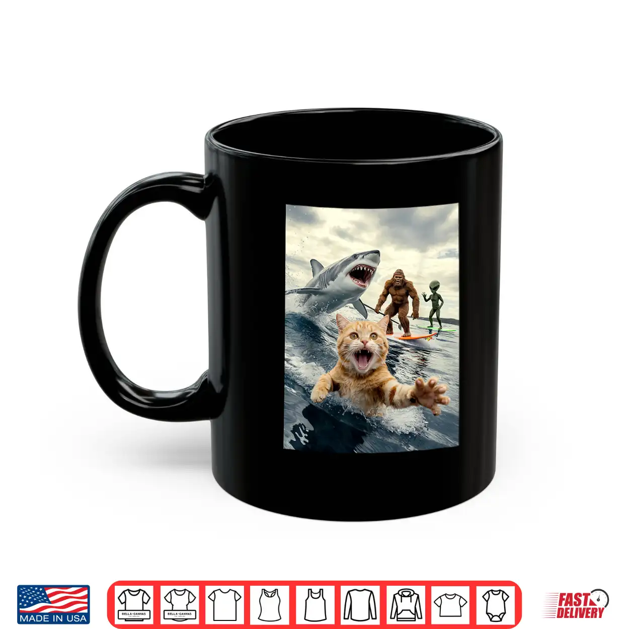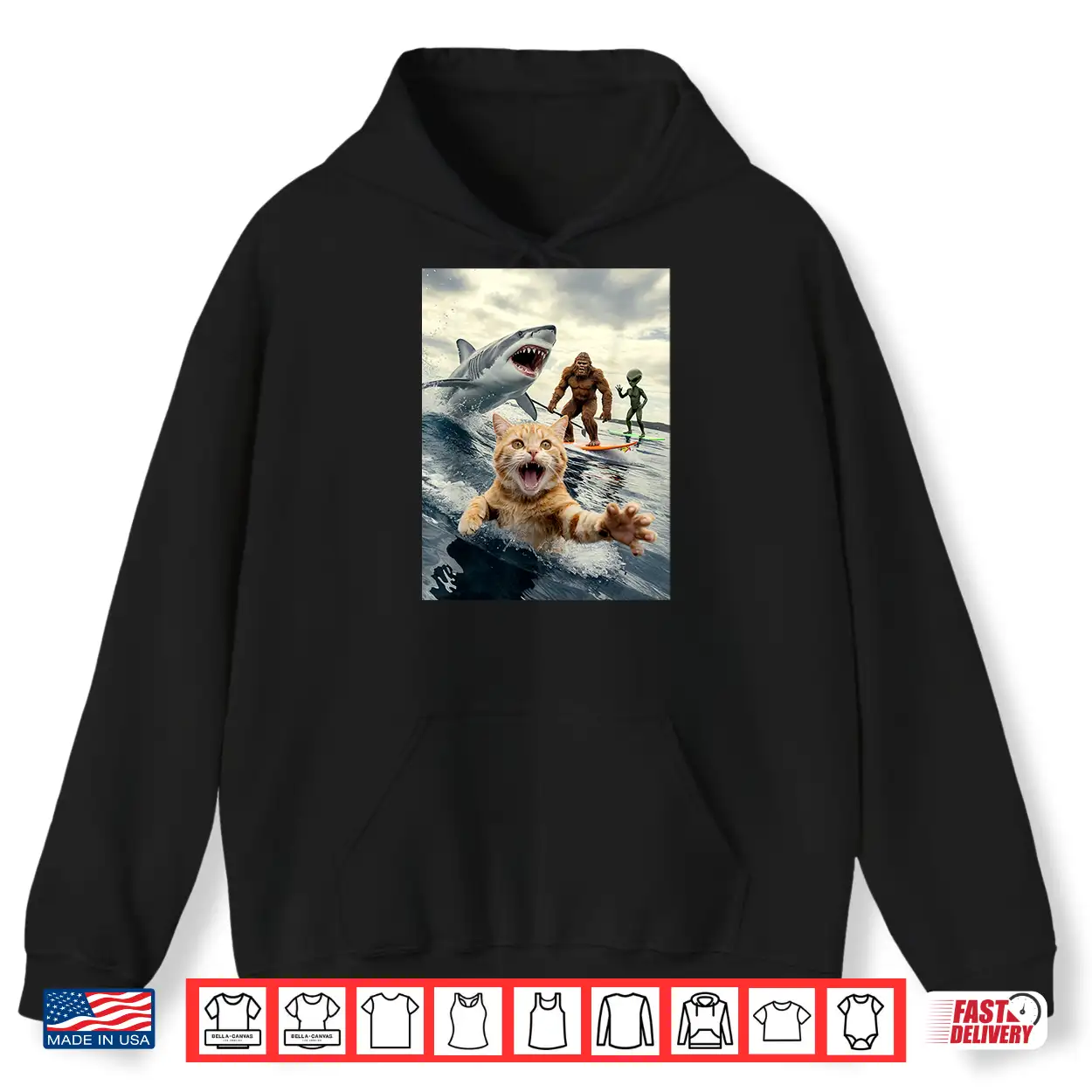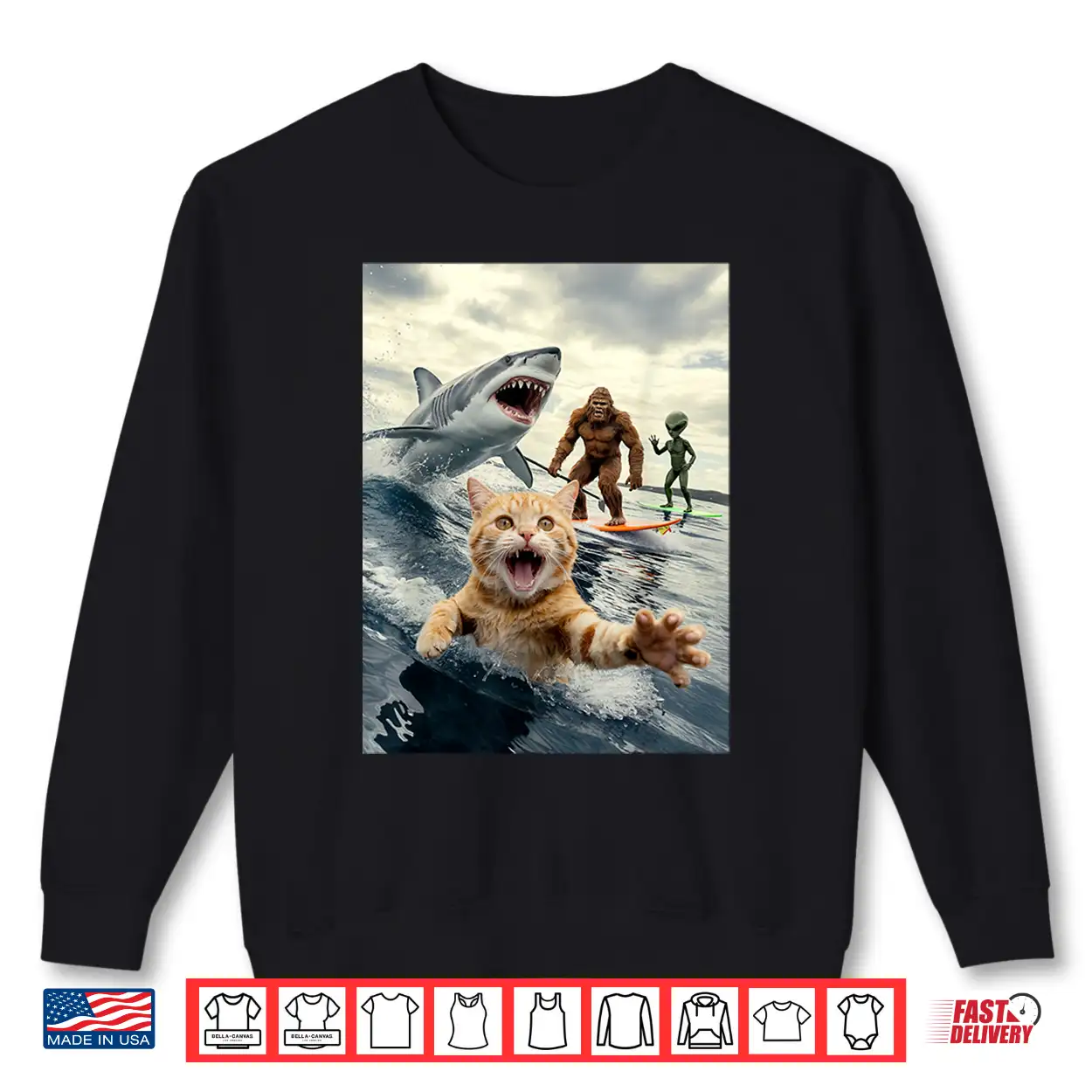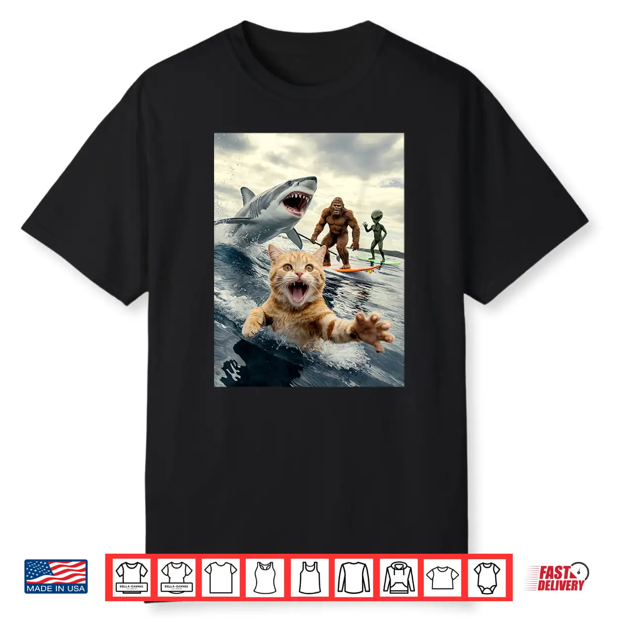 Funny Cat Surfing Bigfoot Alien Shark Shirt