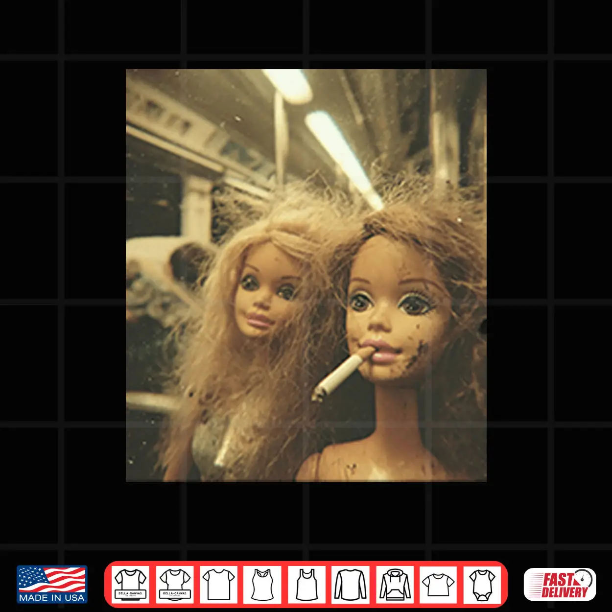 distressed doll, smoking meme, irony, aesthetic, internet culture, edgy, dark humor, viral, weird, shirt