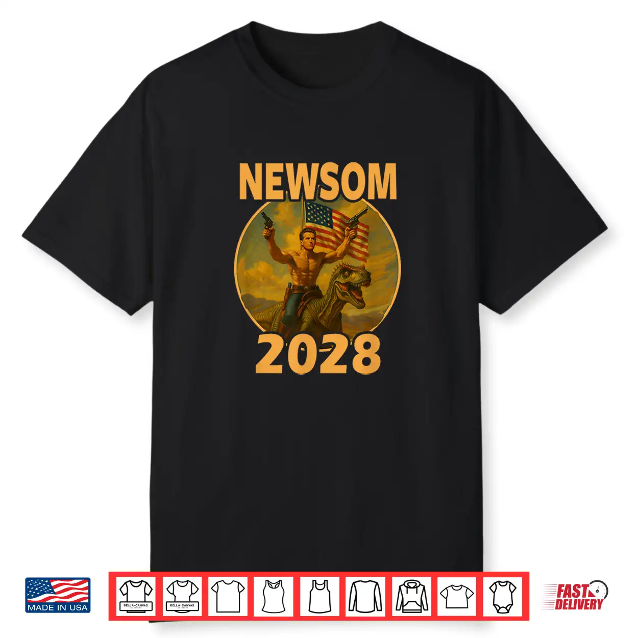 Gavin Newsom 2028 Bold Patriotic Leader Riding Dinosaur Shirt