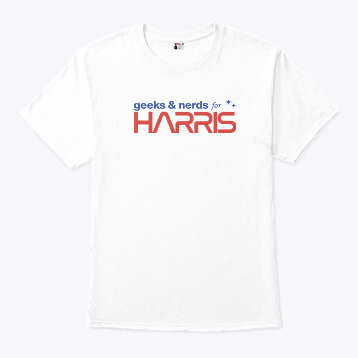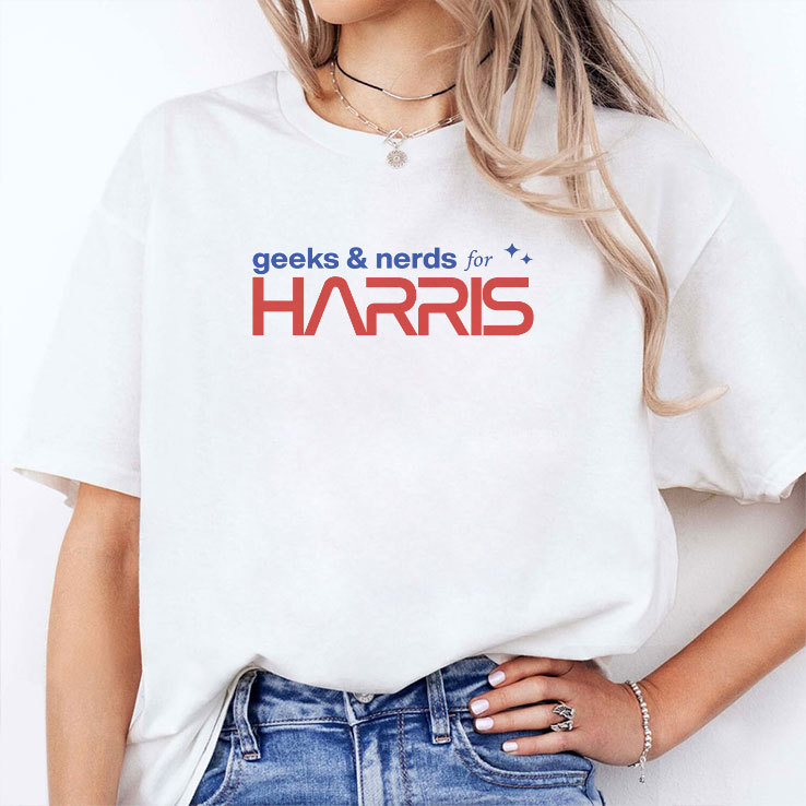 The shirt with the words “Geeks and Nerds for Harris” represents a group of people who identify as geeks or nerds – those passionate about technology, science, pop culture, or intellectual pursuits -showing support for Kamala Harris.
