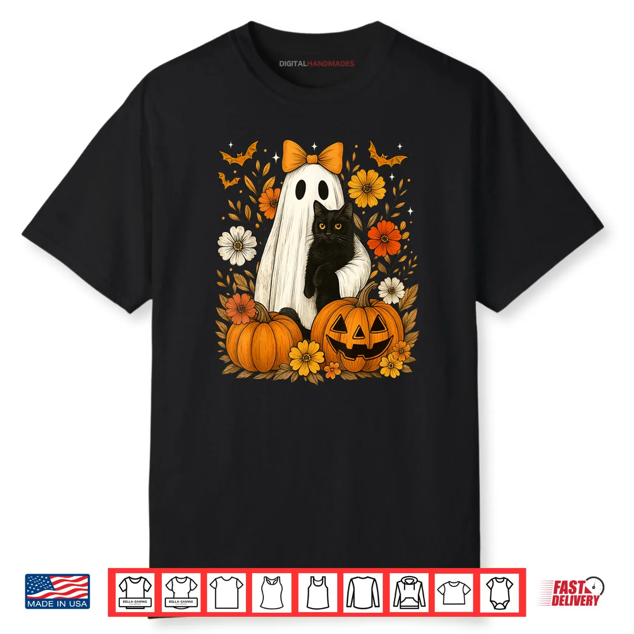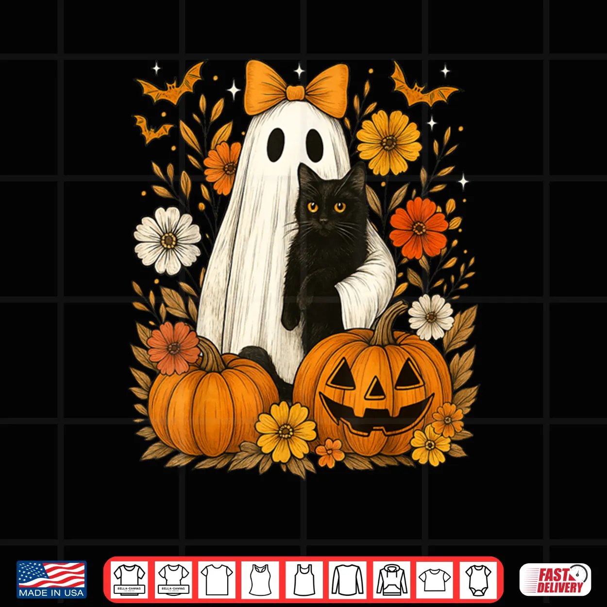 Ghost Holding Black Cat Groovy Floral Vintage Halloween Shirt