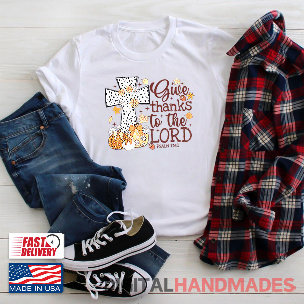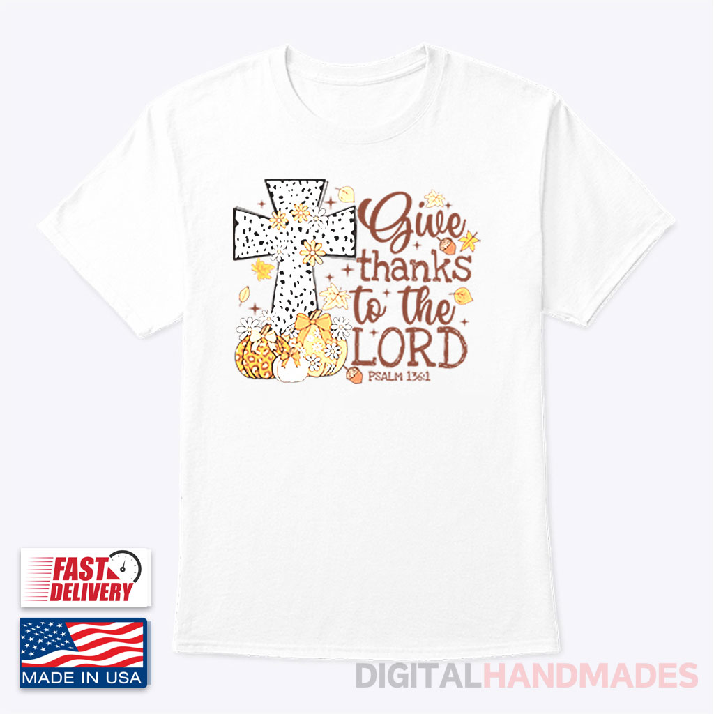 The t-shirt features the Christian Cross among some pumpkins and the phrase “Give Thanks To The Lord”. It refers to a well-known verse from the Bible, specifically Psalm 136:1, which states, “Give thanks to the LORD, for He is good; His love endures forever.” This verse is a call to gratitude and acknowledges the goodness and everlasting love of God.