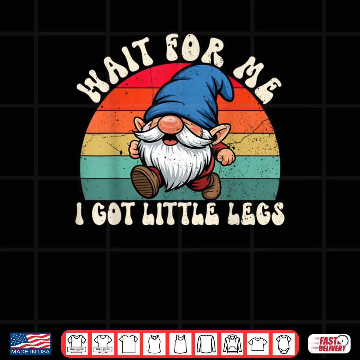 gnome wait for me, little legs, running joke, fantasy art, garden gnome, funny quote, short height, relatable, fairy tale, shirt