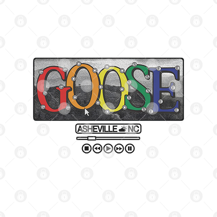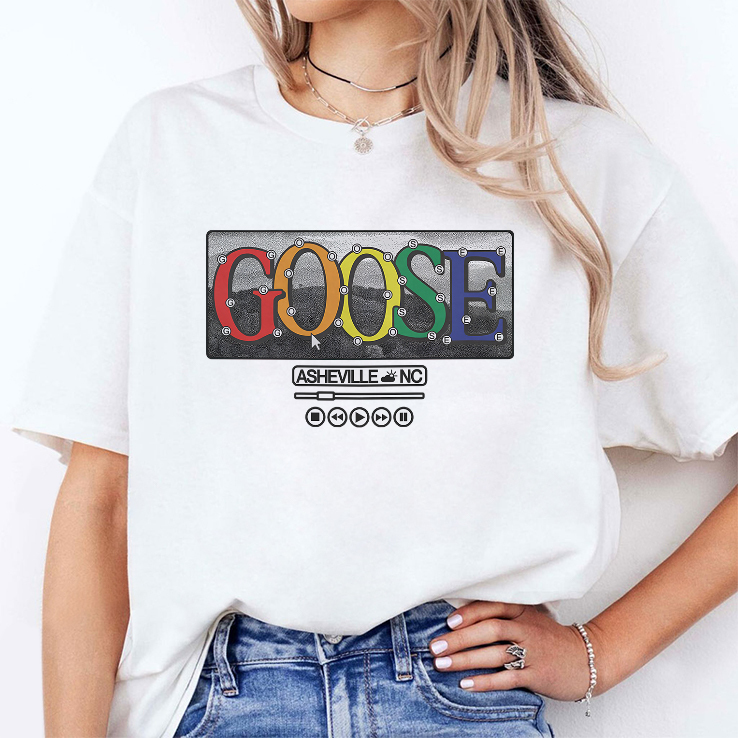 The t-shirt features the logo of the Goose band and the phrase “Asheville NC”. Goose is a popular jam band known for their live performances, blending rock, folk, funk, and improvisational music.