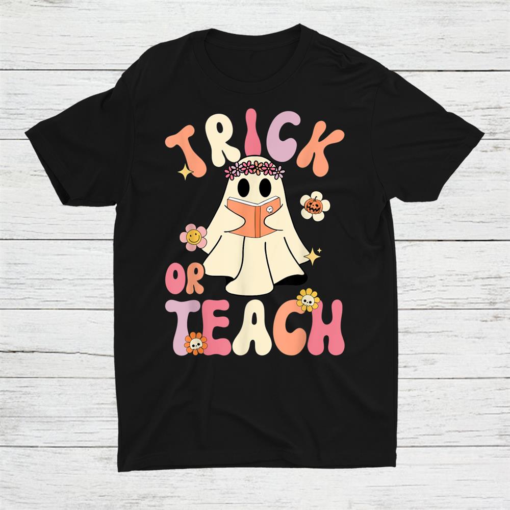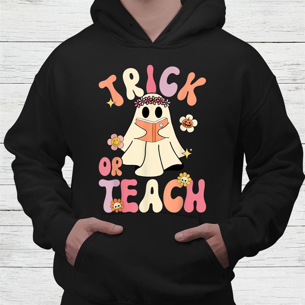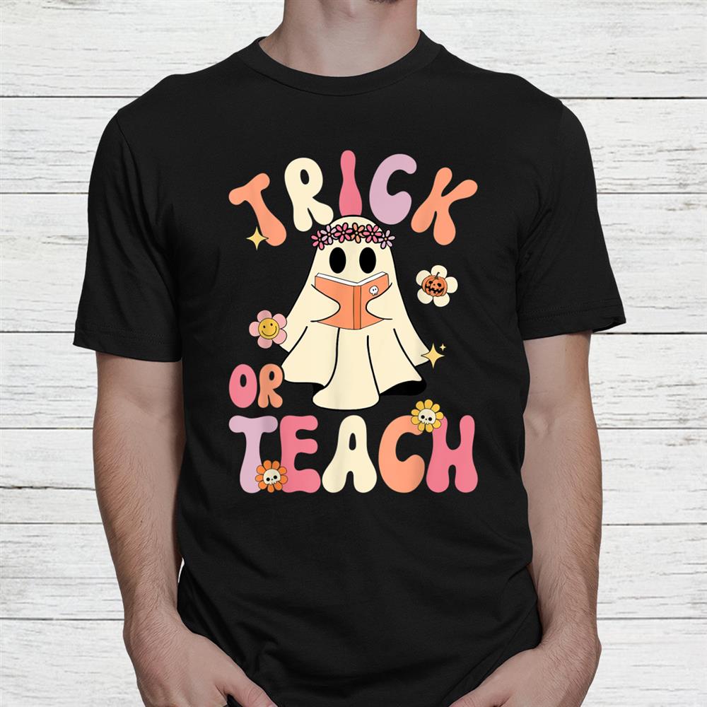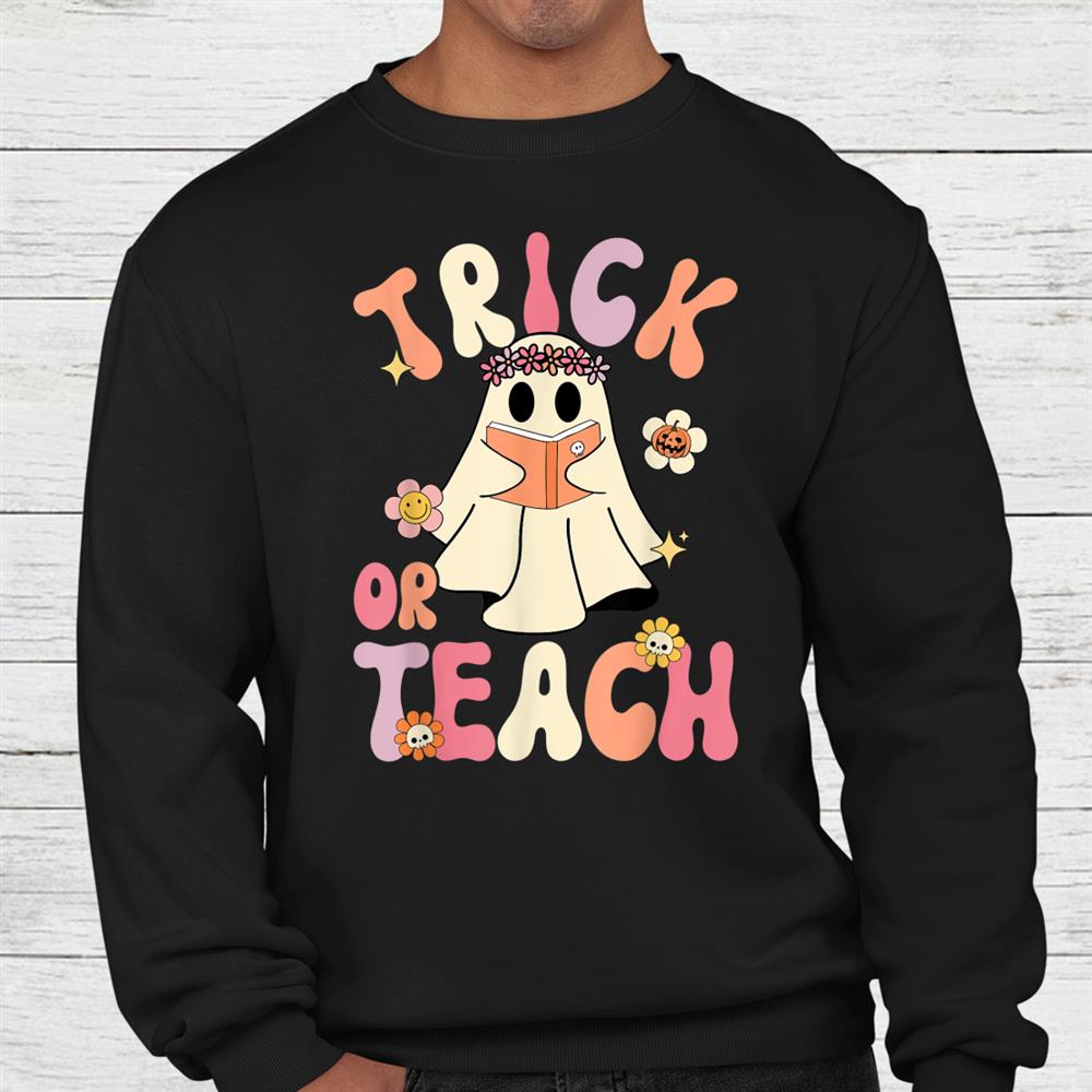 Groovy Halloween Trick Or Teach Retro Floral Ghost Teacher Shirt, hoodie, sweatshirt, long sleeve and ladies T-shirt