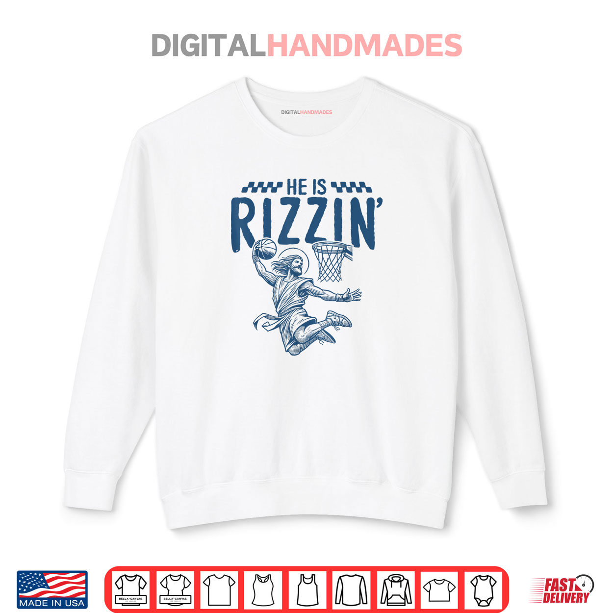 he is rizzin basketball jesus, funny christian easter tee, hoops meets resurrection, religious humor apparel, rizz meme easter shirt, basketball meets faith, easter funny jesus shirt, sunday church sports mashup, gen z christian humor, rizzed out son of god