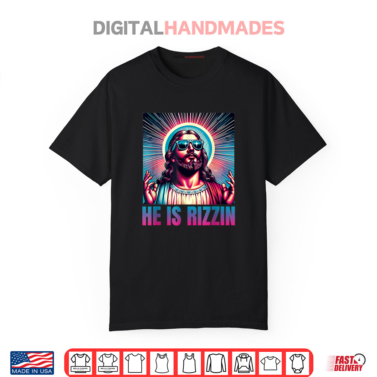 he is rizzin jesus humor design, religious graphic tee, spring faith apparel, funny jesus humor shirt, bold rizzin design, playful casual spring fashion, lighthearted faith tee, springtime quirky style, humorous rizzin shirt, cute christian apparel