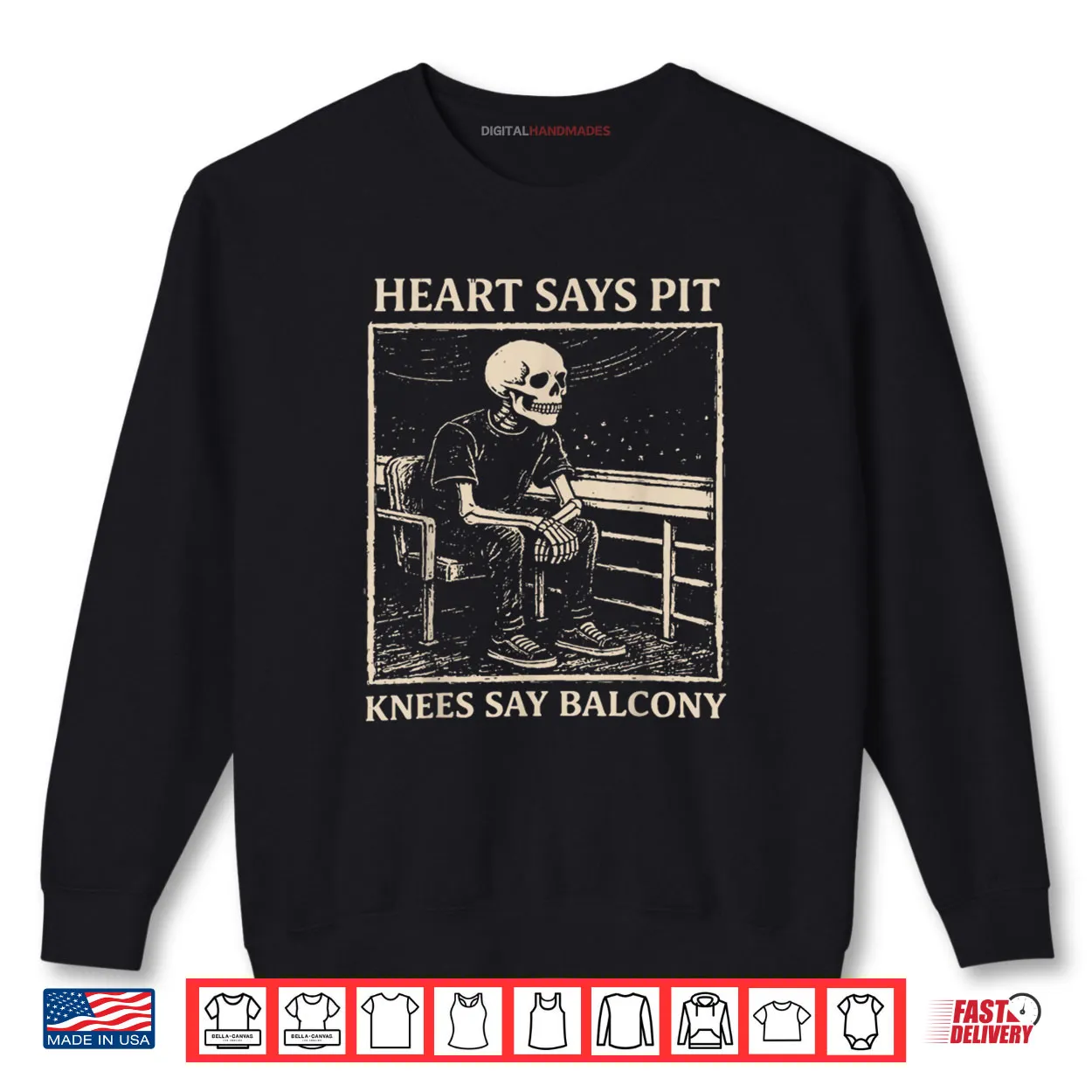heart says pit, knees say balcony, concert humor, music fan, aging, relatable, mosh pit, festival, funny, shirt