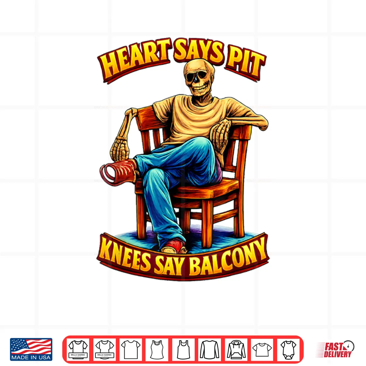 heart says pit, knees say balcony, concert humor, music fan, aging, relatable, mosh pit, festival, funny, shirt