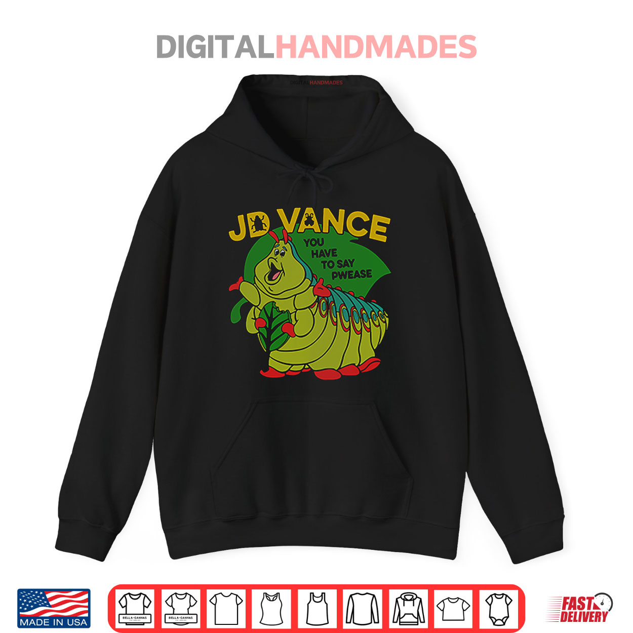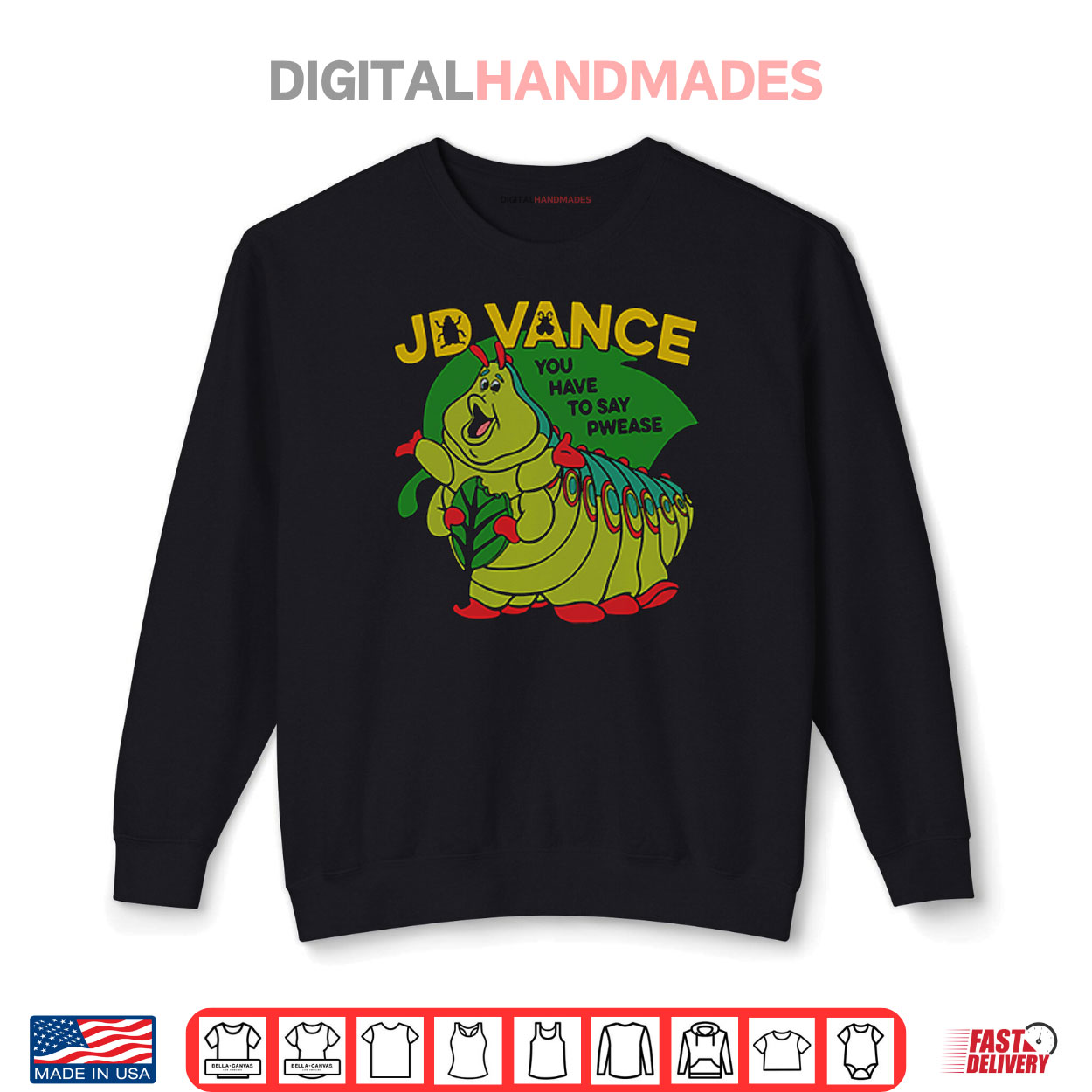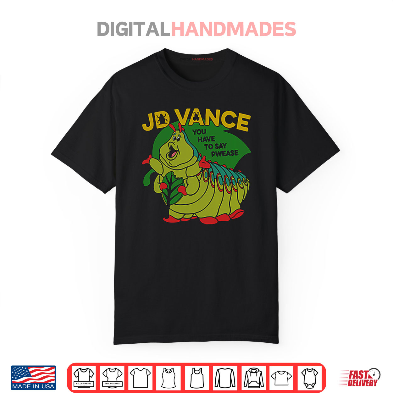 The “Heimlich Bug JD Vance You Have To Say Pwease Shirt” is a humorous and satirical piece of apparel that blends pop culture with political commentary. Featuring Heimlich, the lovable, chubby caterpillar from Pixar’s A Bug’s Life, known for his exaggerated German accent and childlike charm, the shirt pairs this character with a playful jab at J.D. Vance, the U.S. Vice President. The phrase “You Have To Say Pwease,” written in a deliberately childish tone, mimics Heimlich’s speech pattern while poking fun at Vance, suggesting he’s demanding politeness or gratitude in an entitled or immature way.