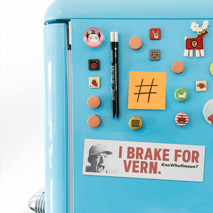 I Brake For VERN Knowhutlmean Car Magnet pays homage to Ernest’s character and his relationship with Vern, combining his familiar phrase with the joke that you would stop or “brake” for Vern.