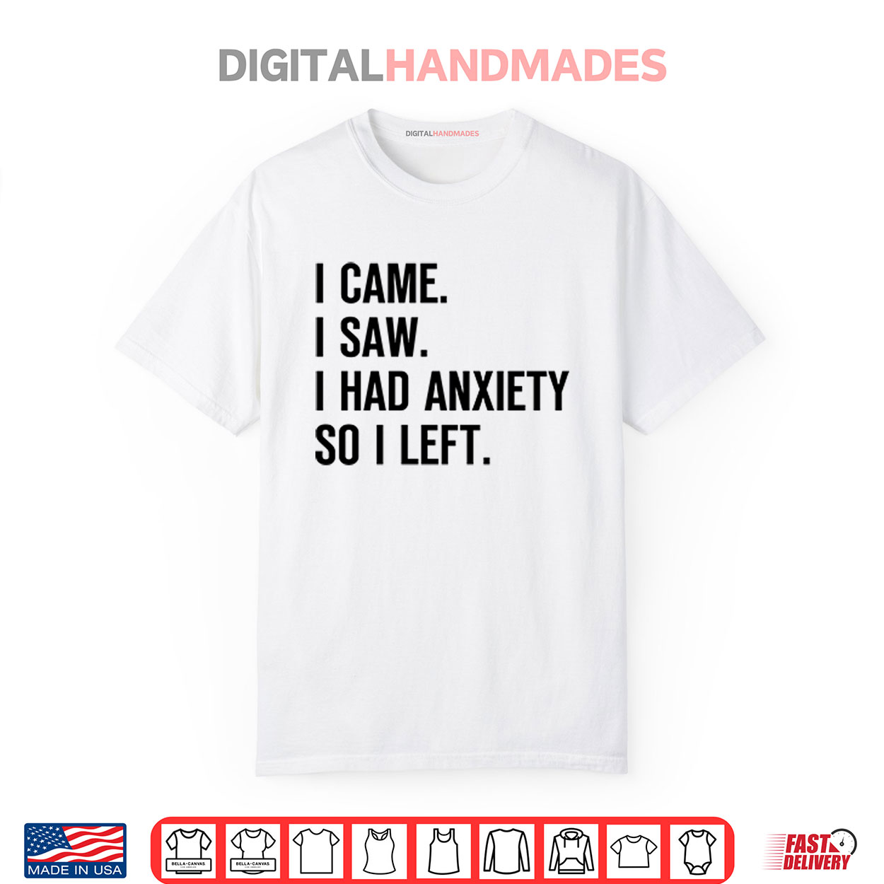 I Came I Saw I Had Anxiety So I Left Shirt, Funny Introvert Humor Shirt, Social Anxiety Relatable Shirt, Anti Social Club Quote Shirt, Anxious Millennial Meme Shirt, Awkward And Proud Shirt, Left The Party Early Shirt, Humorous Mental Health Shirt, Overthinking And Leaving Shirt, Homebody Life Slogan Shirt