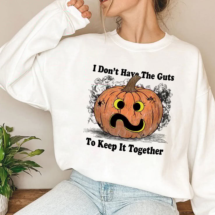 The shirt features a sad pumpkin and the phrase “I Don’t Have The Guts To Keep It Together” which combines humor with the spooky nature of Halloween.