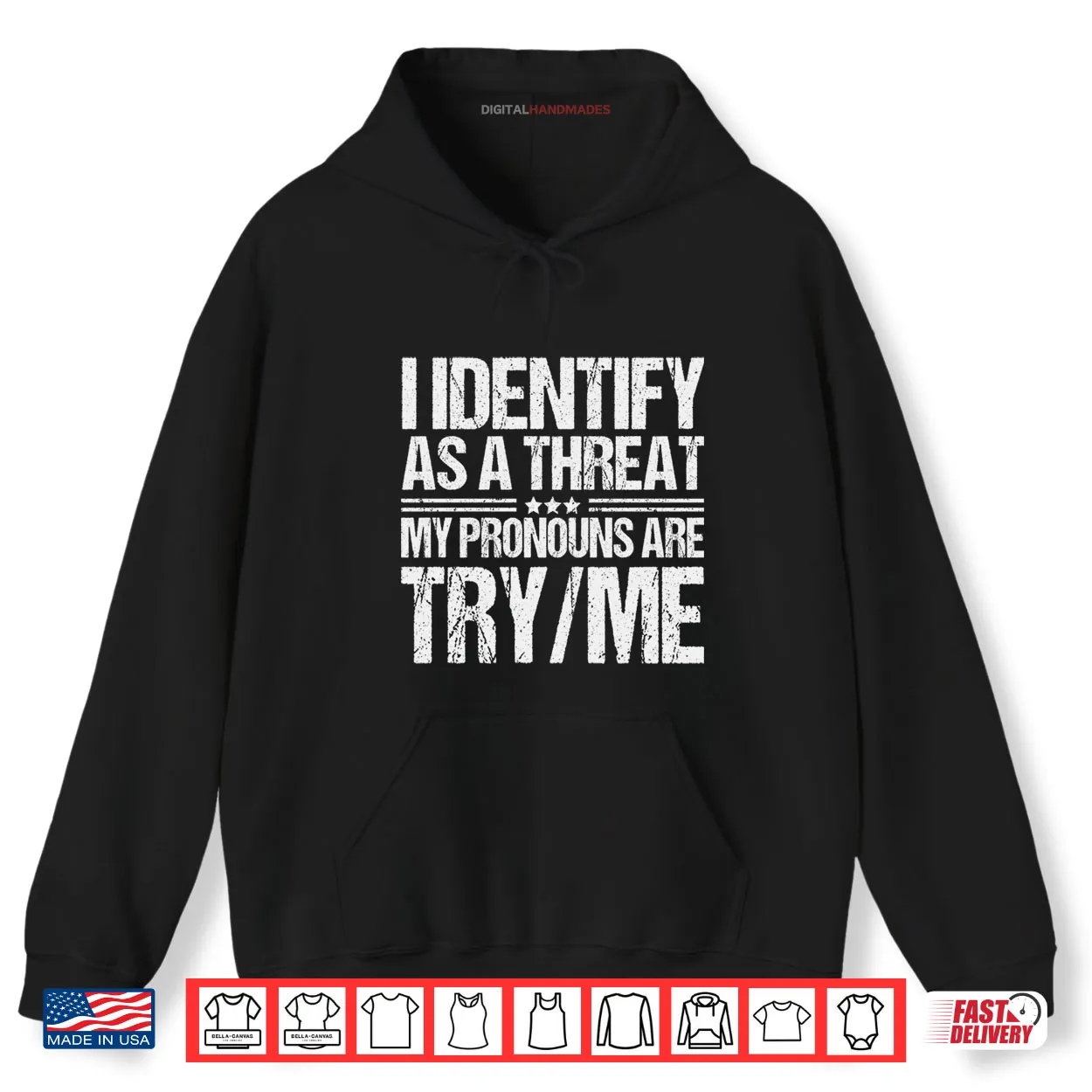 I Identify As A Threat My Pronouns Are Try Me Pullover Hoodie, I Identify As A Threat, Pronouns Are Try Me, Funny, Witty, Humor, Sarcastic, Quote, Trendy
